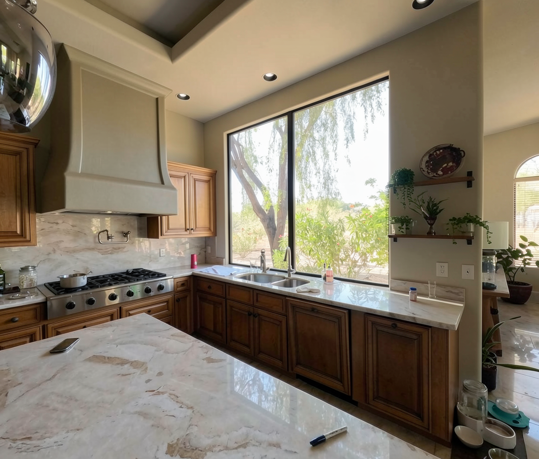 evening lighting in the space add lighting on the marble countertop keep the cabinets white like the source image the walls are painted white show a music video from kendrick lamar on the screen at the right side of the view keep the light effect over the pool table add lighting in the kitchen