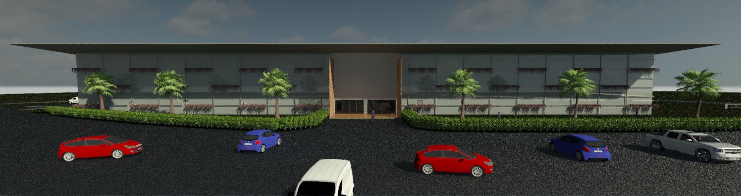 modernist interior shot modern tropical commercial building on a bright sunny day with a sleek butterfly roof extending over a full glass fa ade the face of the building is made entirely of floor to ceiling glass panels adorned with cascading plants and integrated green walls at the center the main entrance is framed by tall vertical wooden louver walls providing shade texture and architectural contrast in front of the building a spacious parking lot with various parked cars sets the scene while people walk across the lot enter the building and interact along the hedged walkways palm trees and manicured greenery enhance the tropical feel photorealistic vibrant lively setting with clear blue skies and crisp shadows architecture