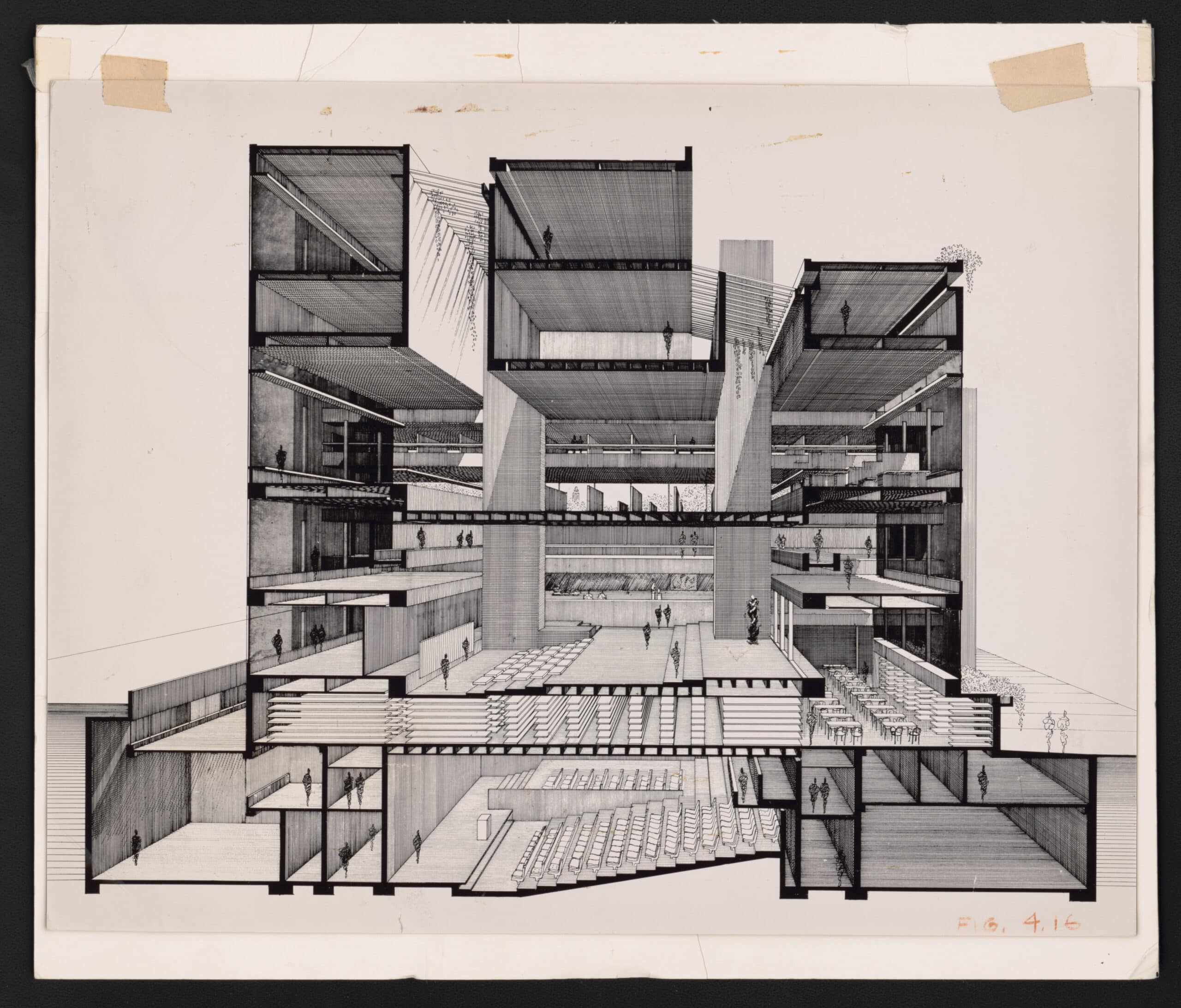 create a photo realistic rendering using this section perspective sill while incorporating a brutalist material pallet incorporate a filter to encapsulate the mood of brutalist architecture