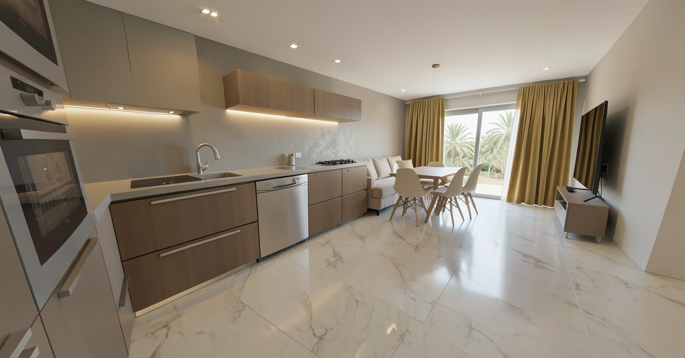 photorealistic interior render based strictly on the provided image and exact sketchup geometry do not change any walls wall positions ceiling height door openings or room dimensions preserve all architectural elements exactly as modeled modern narrow open plan kitchen dining and living space with a calm greige color palette matte finishes and subtle natural oak accents kitchen remains exactly as modeled l shaped layout unchanged slim upper cabinets on the right hand wall only exact size depth height and placement of upper cabinets must match the sketchup model tall cabinets keep original height no extension upward induction cooktop with integrated downdraft extractor no wall hood no ceiling hood integrated warm led lighting beneath upper cabinets microcement polished plaster wall finish behind the kitchen no structural pillar exists the wall is straight and continuous no column no vertical obstruction no reinterpretation dining area remains centered and unchanged as shown in sketchup living area layout strictly follows the model sofa positioned along the right hand wall behind the dining table maintain clear circulation path through the space sofa must not move closer to the kitchen television mounted directly on the left wall wall hung flat minimal no tv bench or cabinet below sliding doors remain exactly as modeled view through doors shows mediterranean exterior with palm trees bright natural daylight floor to ceiling curtains at the doors heavy velvet fabric in warm gold tone elegant folds mounted close to ceiling height open to frame the view flooring remains large format marble look porcelain tiles with warm undertone matte finish walls in soft warm greige smooth finish ceiling lighting designed for low ceiling height ultra slim recessed or flush mounted micro downlights no lowered ceiling no soffits no bulkheads scandinavian mediterranean modern style calm premium realistic airbnb ready buildable camera perspective must match the provided angle exactly field of view 60 65 degrees no wide angle distortion ultra realistic materials accurate scale natural lighting balance no people no indoor plants no artwork no decorative clutter no furniture repositioning