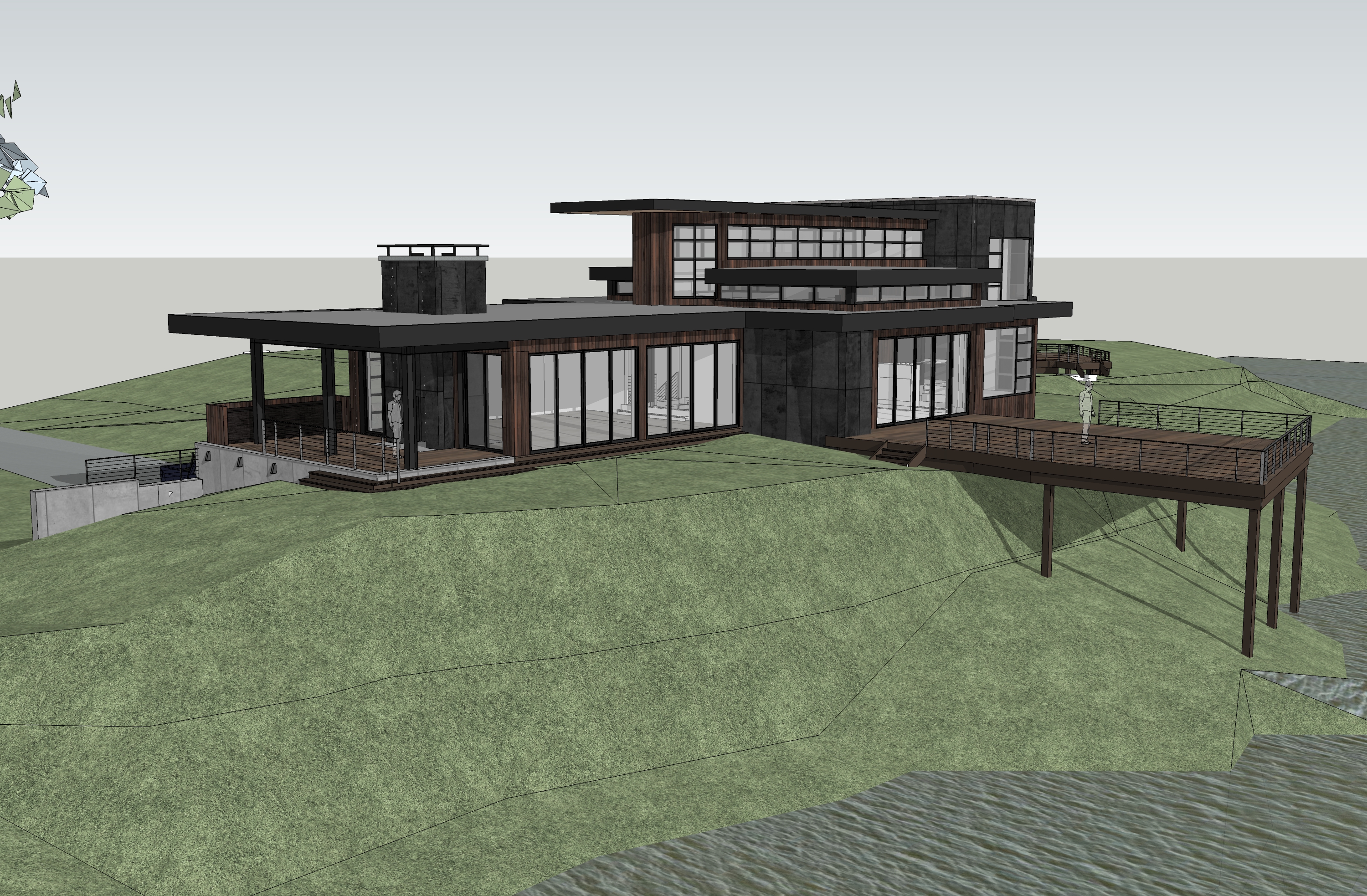 aerial view industrial home design matte dark wood vertical siding matte black panel accent walls lake in foreground trees in background
