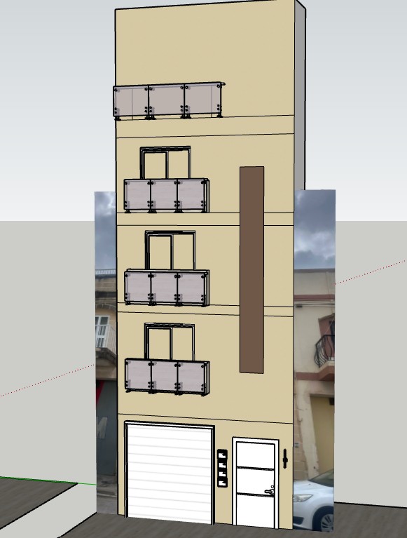 ultra realistic architectural rende of an apartment building facade based on the provided sketchup model maintain the exact geometry proportions and material layout from the original image preserve the original color palette strictly as shown incorporate clear glass balcony railings with subtle reflections and realistic transparency window and door apertures should be crisp white clean lined and modern apply highly detailed material realism stone texture subtle imperfections soft weathering and accurate light interaction lighting should be natural mediterranean daylight soft warm sunlight slightly angled producing realistic shadows and depth include ambient occlusion and global illumination for depth and realism add a realistic urban residential context clean pavement and a calm street atmosphere camera angle eye level or slightly low angle to enhance facade presence use a professional architectural photography style with balanced exposure sharp focus and realistic depth of field sky soft blue sky with light haze natural and not overly dramatic overall mood premium residential development warm modern mediterranean aesthetic clean minimal and inviting