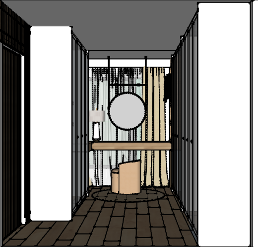 a luxurious and serene walk in closet featuring a glass closet enclosure add clothes display inside with soft wood floor tiles and brass fixtures natural wood dresser table accented by elegant brass hardware the atmosphere is calm and inviting with abundant natural light filtering through the window add ceiling cove lighting do not change any structure