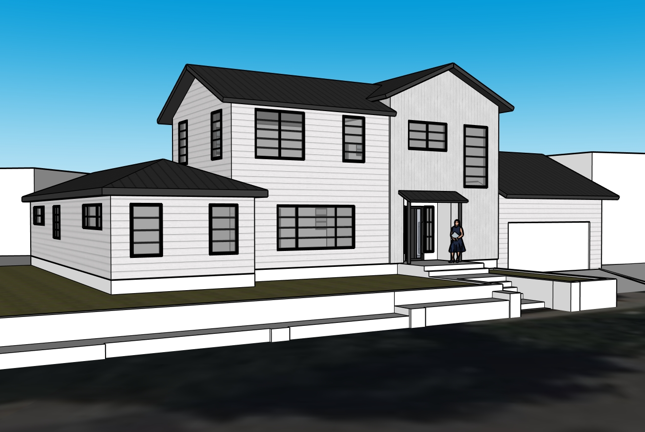 sunny day with a few clouds this view is looking northwest add trees to the sides but don t block the house too much add flowers and grass near the house there is a sidewalk and street in front of the house connect the driveway in front of the garage to the street there is a retaining wall to the southern part of the yard the path from the front door should connect via concrete stairs to the sidewalk