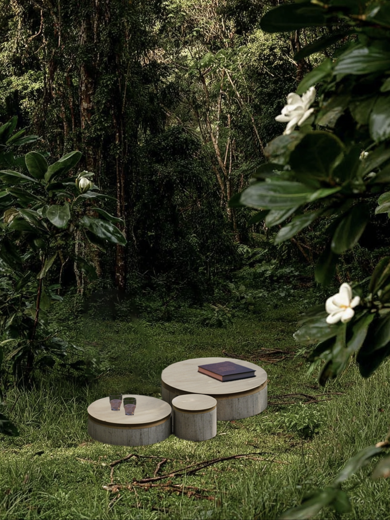 keep it all oroginal make it like enjoy and believeble if we seat in there render sunset sky pink blue add glass of water on the top of table surrounding with forest jungle wild tropical and gardenia shrubs