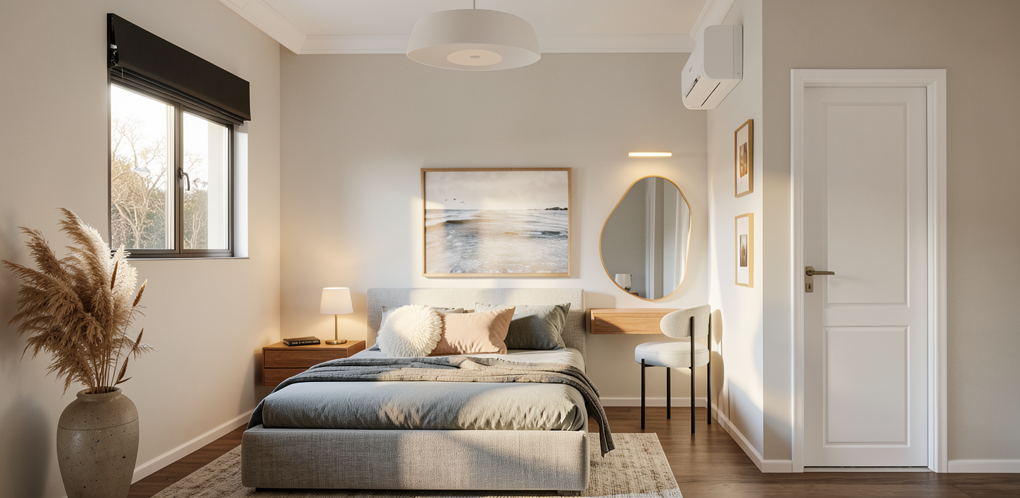 sleek modern living room minimalistic design with warm and cozy atmosphere white walls soft boucle textured beige sofa oak wood flooring large windows with sheer white curtains green indoor plant with a sleek stone pot flat screen tv on a white and beige marble entertainment unit wall clock with an antique brass frame rattan chair with cream cushion neutral toned circular rugs a small round beige fluted coffee table with a decorative pineapple soft light through the windows creating a calm and inviting space