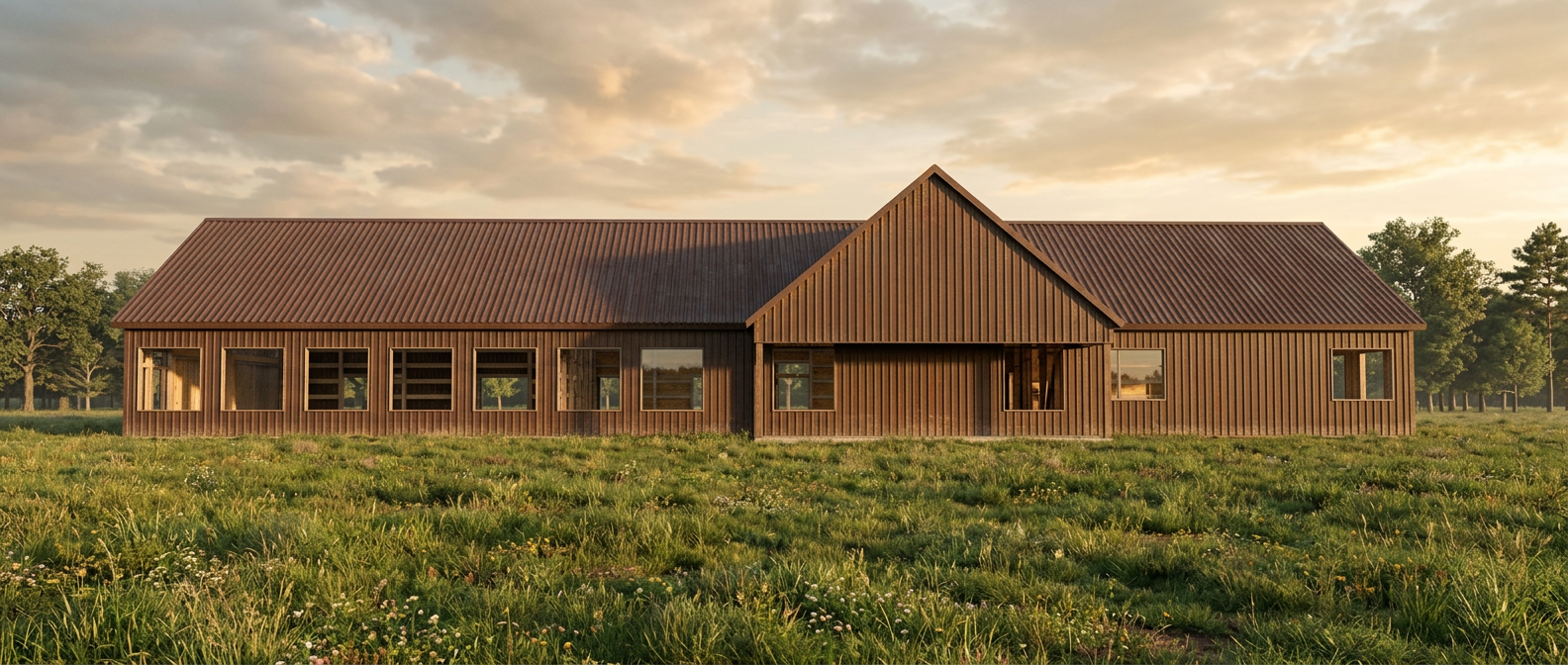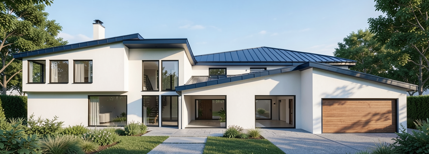 photorealistic render exterior view modern residence with white stucco walls dark blue metal roof with dark blue trim windows with black frames stained wood garage door green landscape