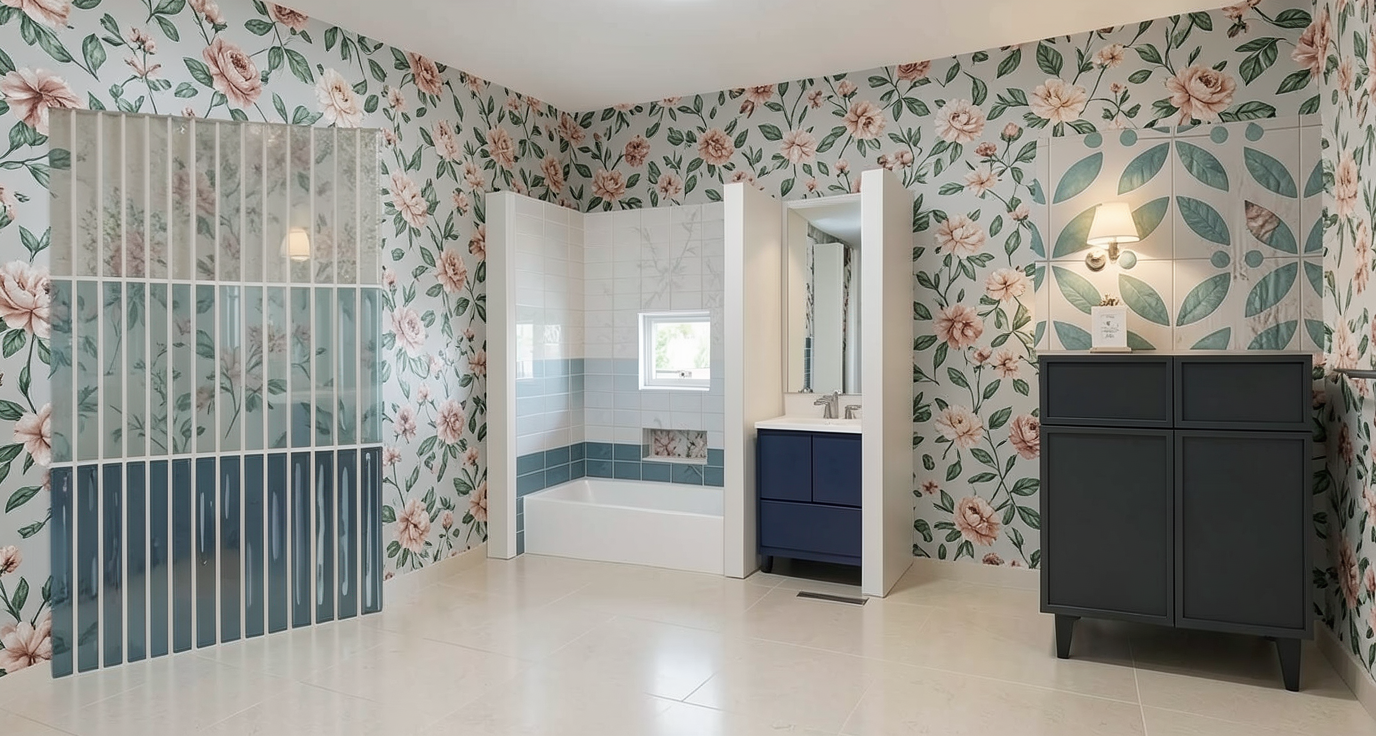 exterior shot keep everything the same but change to a tub surround with chrome bathroom fixtures