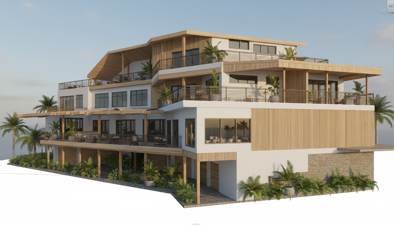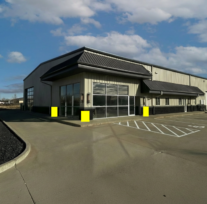 replace the yellow boxes modern black planters with greenery do not change anything else about the photo