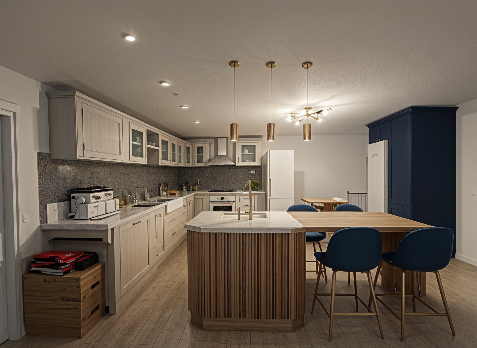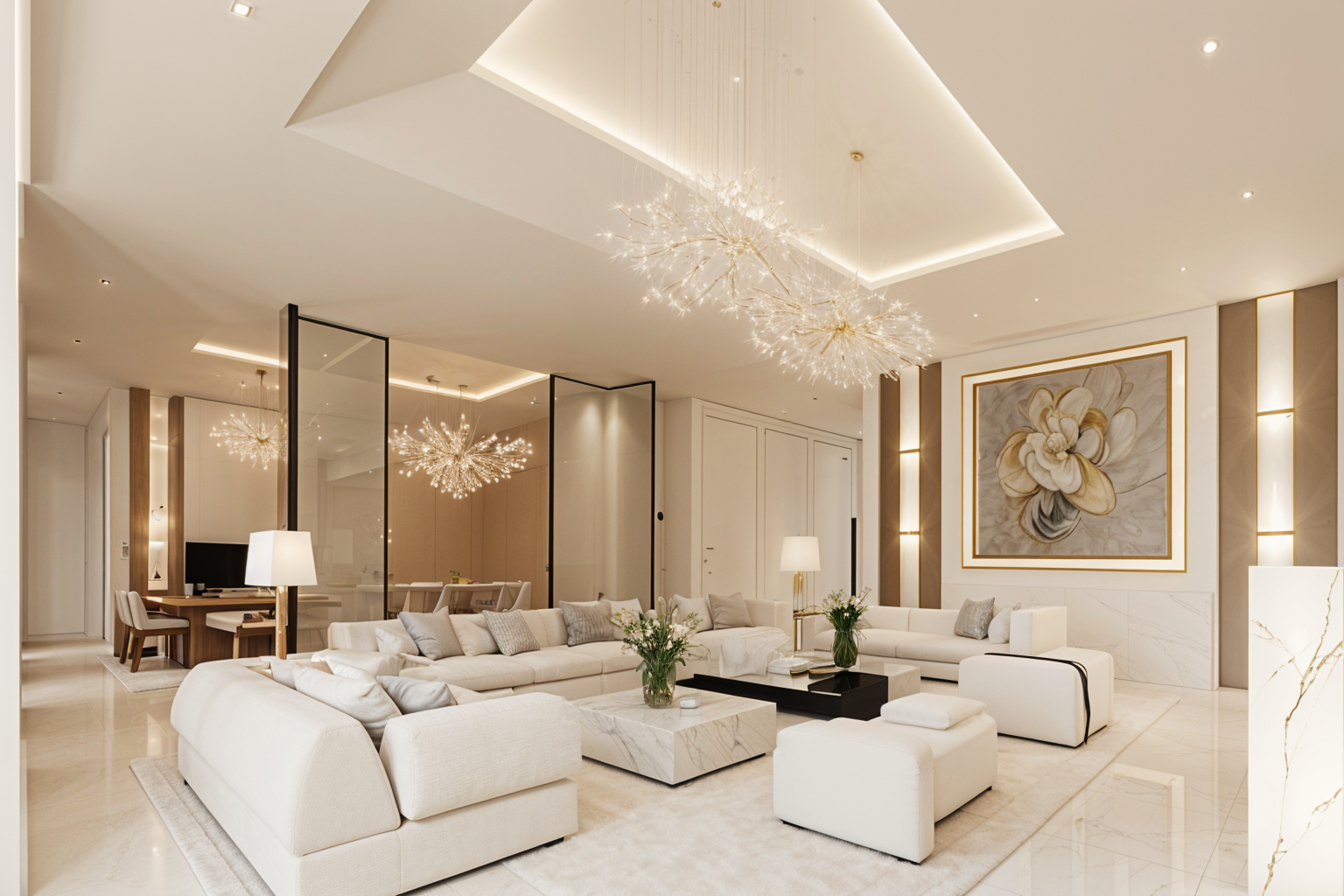 interior shot luxury interior timber cladding walls modern sofas modern chandelier large black dining table black coffee tables black and white colour palette