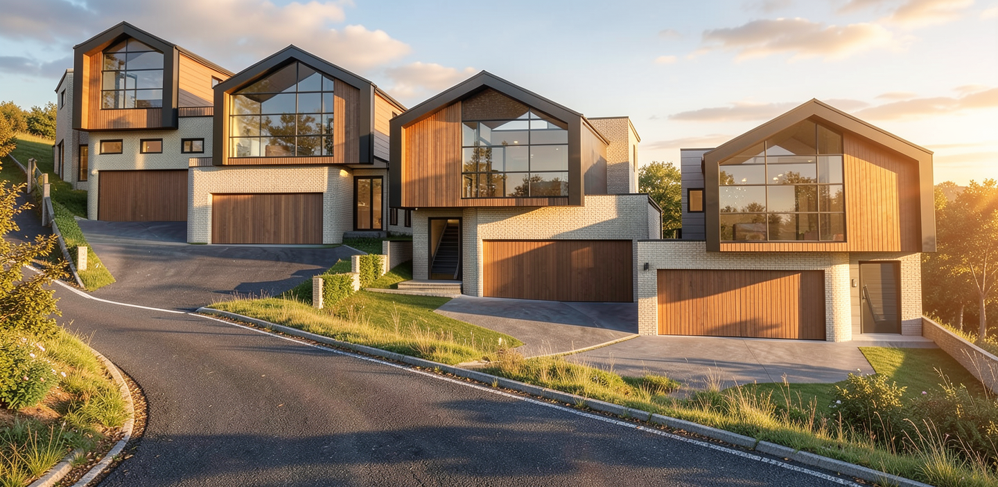 g n rer un rendu 3d photor aliste partir de cette image en conservant fid lement le sens des rev tements les couleurs les volumes et proportions du b timent appliquer des mat riaux r alistes int grer le b timent dans un environnement naturel cr dible avec une v g tation typique du qu bec utiliser un clairage naturel uniforme et diffus lumi re du jour clairant de fa on gale la maison et le garage avec des ombres douces et un ciel l g rement nuageux am nager un chemin d acc s en asphalte menant au garage et un chemin vers la maison mettre de la v g tation devant la maison