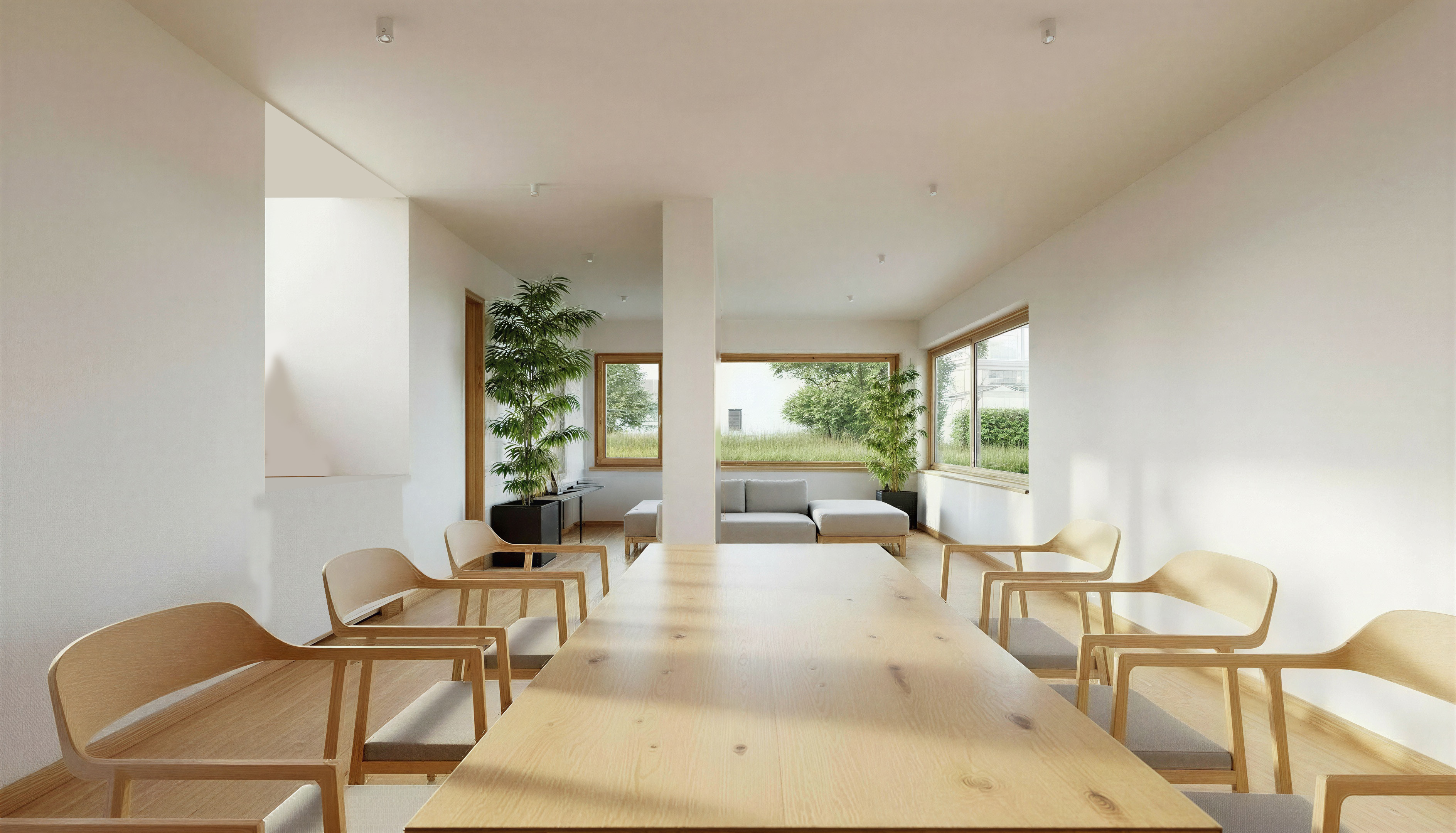 render this interior in a calm minimalist scandinavian japanese inspired style keep all architecture exactly as it is do not add or change walls or geometry use warm soft natural light keep the light wooden floor light wooden window frames and the simple white walls replace the dining table with a high quality light oak table replace the chairs with elegant scandinavian design chairs with wood frames and lightly upholstered seats in a warm grey beige fabric make the sofa in the background cosy modern and light grey vegetation outside a natural garden soft shrubs realistic greenery and a white neighboring house with no windows visible through the left window keep the right side greenery exactly as it is do not add reflections on windows no changes to room layout architecture