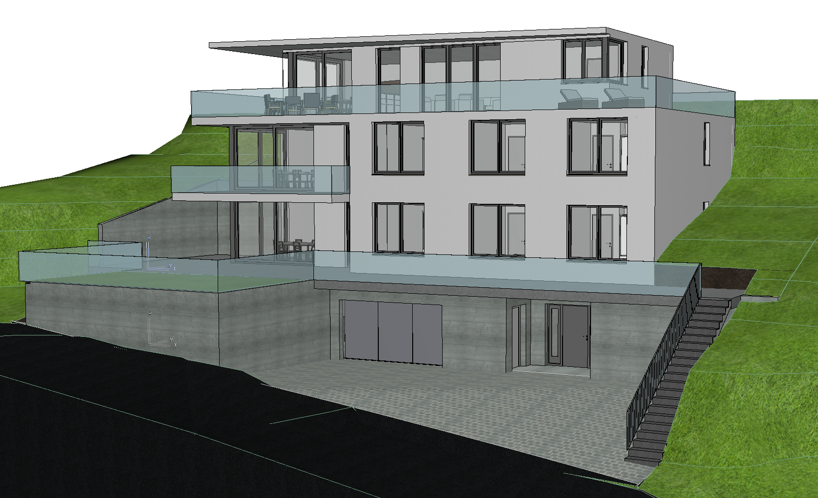 please use the uploaded image as the base model for the rendering it s a modern villa keep the architecture exactly as it is add realistic and elegant landscaping with trees shrubs and natural ground textures to enhance the composition focus on a clean contemporary atmosphere with balanced lighting and natural shadows