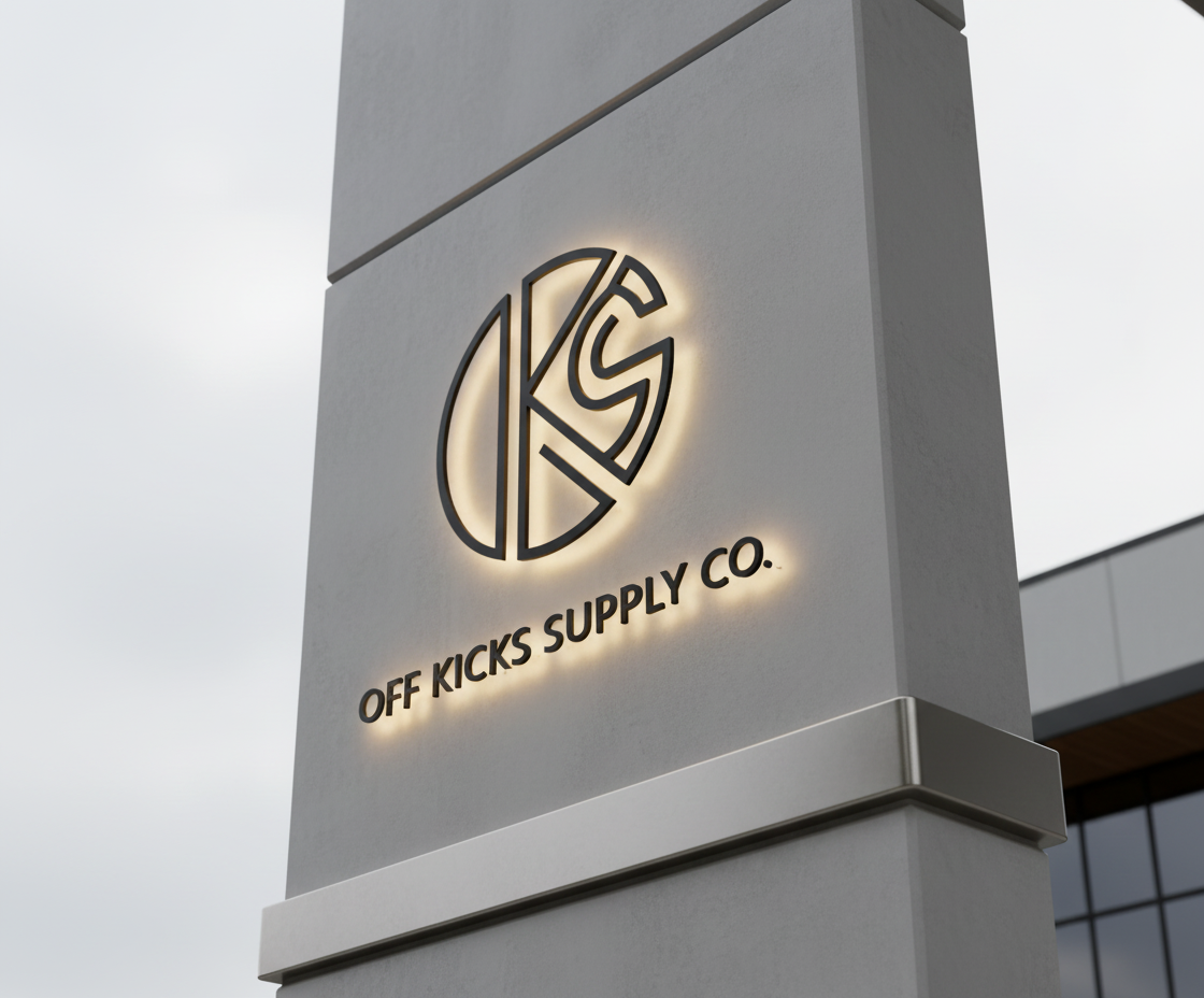 create a photorealistic exterior architectural signage visualization in sketchup vray 5 style the scene shows a modern minimalist illuminated sign mounted on a light gray white vertical panel wall with the same curved architectural form and structure visible in the reference image featuring the dramatic curved base connector element at the bottom the sign displays the off kicks supply co logo circular geometric monoline design with kc letters rendered in high contrast matte black metal letters critical lighting setup sunset scenario the logo is bathed in warm saturated golden amber sunset light that grazes across the sign surface at a low angle approximately 30 45 degrees from the horizon the led backlighting creates a luminous warm glow halo effect around the matte black letters complementing the natural sunset illumination the light creates dramatic warm shadows and dimensional depth on the vertical wall panel the sky features a rich golden orange gradient transitioning to soft peachy salmon tones and deep amber hues characteristic of late golden hour sunset conditions technical specifications medium photorealistic 3d architectural rendering style modern minimalism with premium branding aesthetics lighting scheme dual light system combining natural sunset sun warm color temp 2500 3000k with accent led backlighting sunset sun position low angle western horizon perspective creating side lighting on the facade ambient golden hour atmospheric conditions with warm color cast background dramatic sunset sky with rich orange amber gold and purple transitional tones camera 45 degree angled perspective view from ground level architectural photography angle render engine vray 5 photorealistic with advanced sun and sky systems resolution 8k ultra high definition color palette warm sunset golds deep ambers matte black typography luminous backlighting glow peachy wall tones mood premium dramatic warm upscale evening ambiance material details wall surface smooth matte light gray composite concrete finish with warm sunset reflection architectural form maintains the curved sculptural base element visible in reference image logo letters matte black powder coated aluminum or steel with warm led backlighting lighting warm white led 2700 3000k creating visible glow halo natural sunset sun illumination base bracket brushed stainless steel catching warm sunset highlights ambient environment urban plaza or building entrance setting at golden hour atmospheric details sun angle low creating long warm shadows sky gradient sunset orange golden amber peachy salmon deep purple top atmospheric perspective slight haze warmth in air creating atmospheric glow shadow play dramatic warm and cool shadow interplay on wall surface reflective quality wall surface subtly reflects warm sunset light composition dramatic low angle looking slightly upward emphasizing the sign s prominence against the dramatic sunset sky the lighting creates strong dimensional depth and premium aspirational mood the curved architectural base element is clearly visible and integrated into the composition
