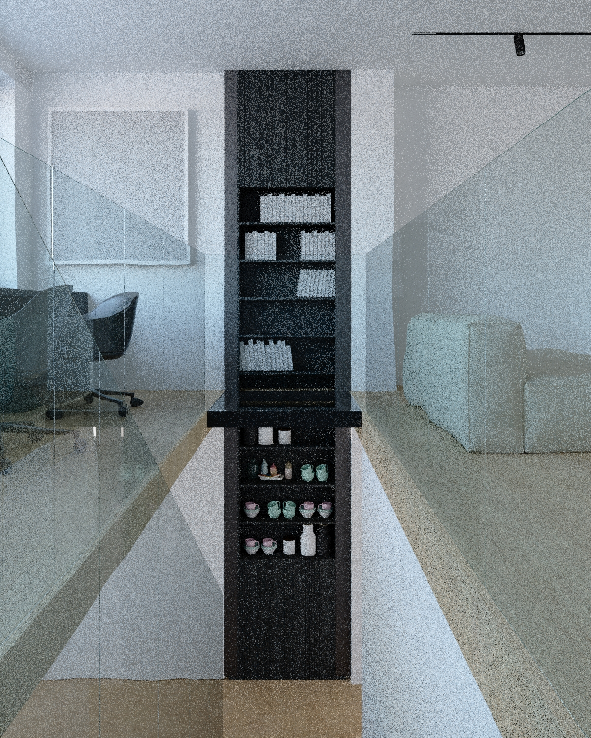 render a modern interior space with a minimalist aesthetic include a central black bookshelf filled with books the surrounding walls are pristine white contrasting with the light oak wooden floor on the left place a sleek modern office chair in charcoal gray next to a transparent glass railing on the right add a cozy light beige sofa the atmosphere is calm and serene with soft natural lighting streaming in creating a peaceful and sophisticated ambiance on the left is a modern impressionist painting