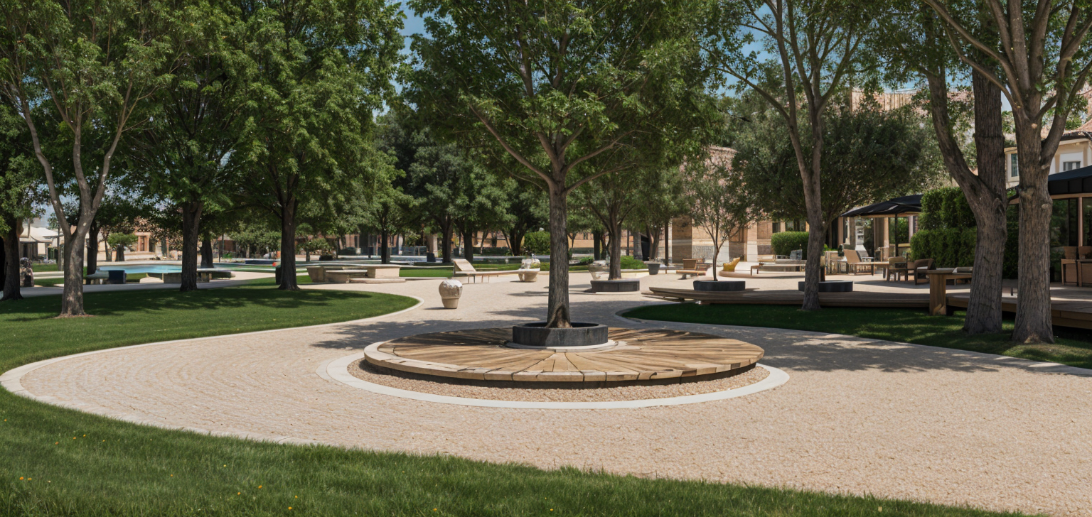make this picture very realistic instead of the green area put there park grass instead of the paving there should be compact gravel natural material do not put the grass in the green circle there shoul be walkable modern wooden platform with tree in the middle in the background there is road with cars and high apartment buildings slovak architecture style add there people to make it more real make the platfrom more wooden like