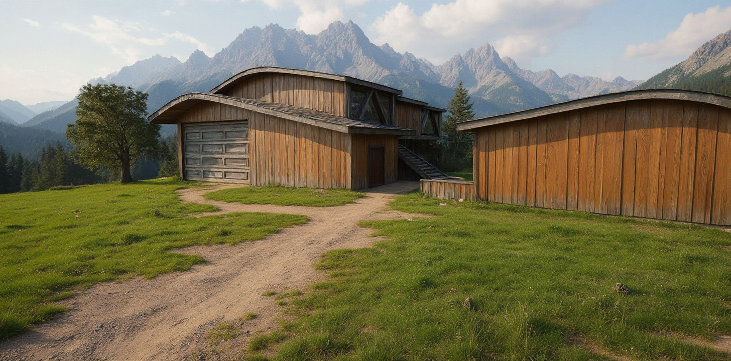 watercolor render of modern craftsman style home with natural color pallet and stone accents include trees and an alaska like environment in the background simple driveway and walkways in front of the home