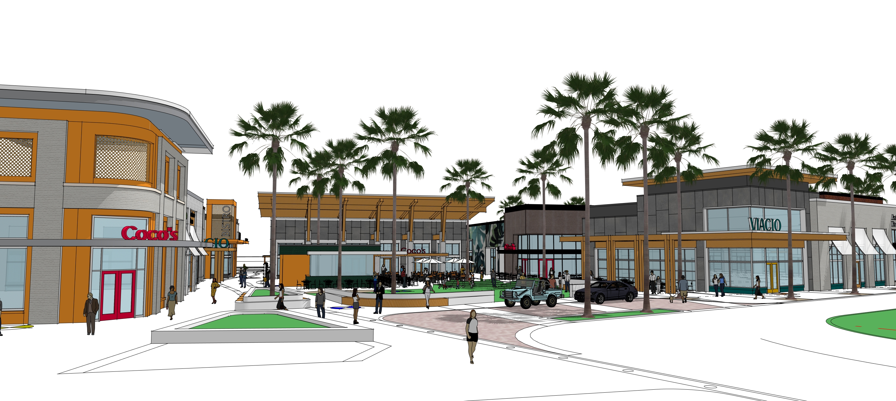 make brick material on lef hand side building white add more people and children walking remove cars remove image graphic from second story glazing of the left hand side building add cluster of 6 7 outdoor dining in the central plaza space but also keep some green turf grass in the central space keep roadway color on the right hand side