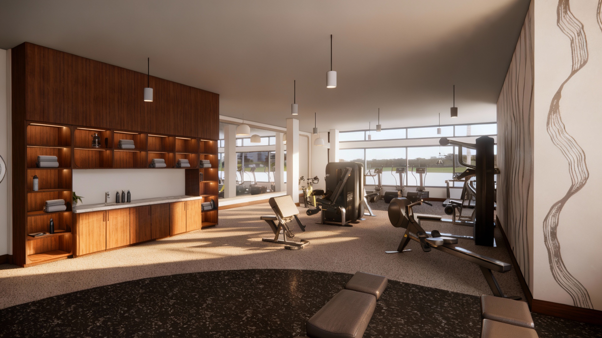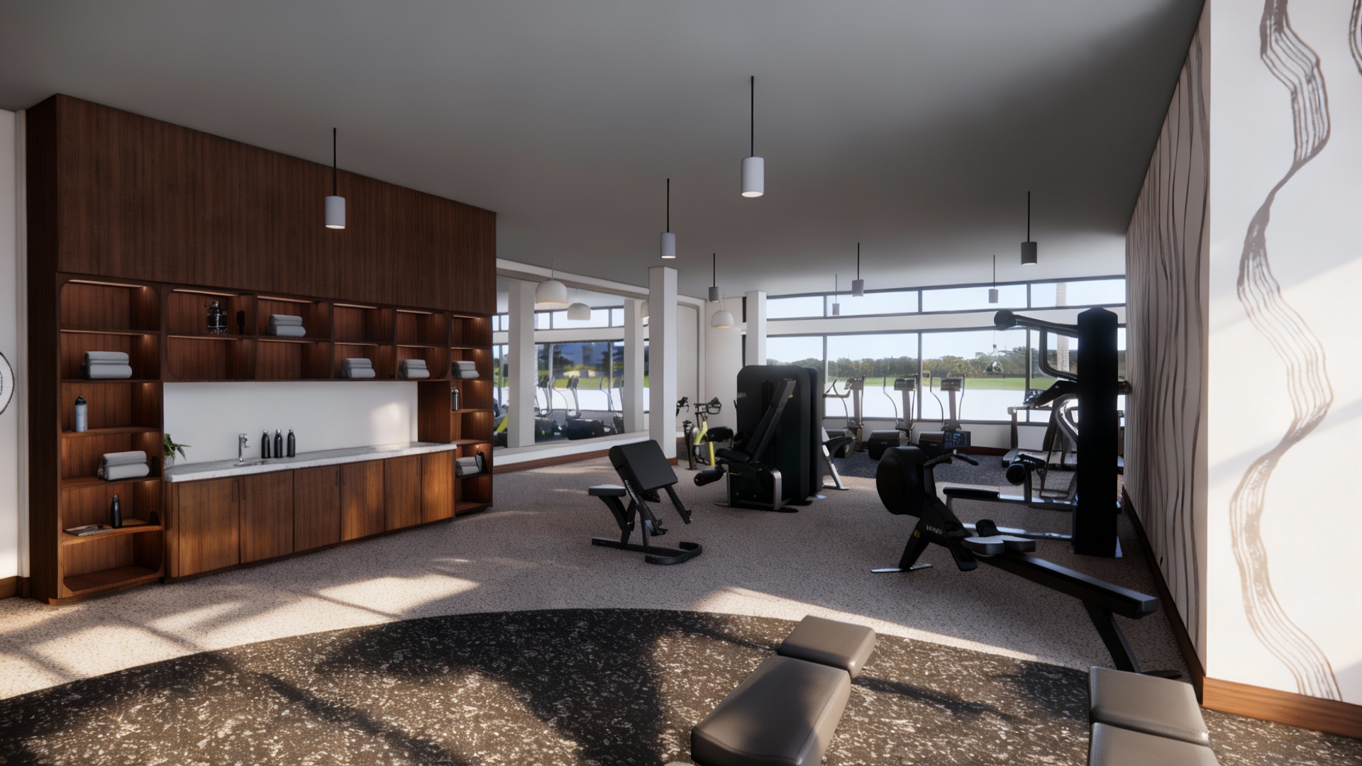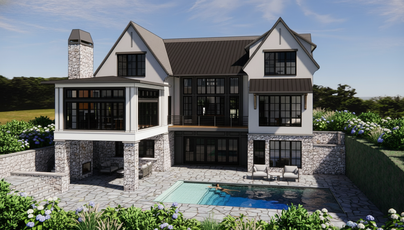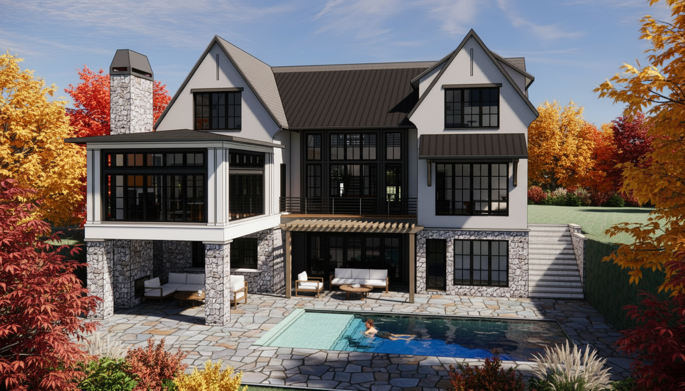 white stucco walls earth tone mountain stone rectangular bluestone paving at patio modern patio furnishings person in pool add narrow stone stair from patio up to grass area add lush landscape to grass foreground and background add adults conversing on the patio and balcony add hosta plants in foreground of patio