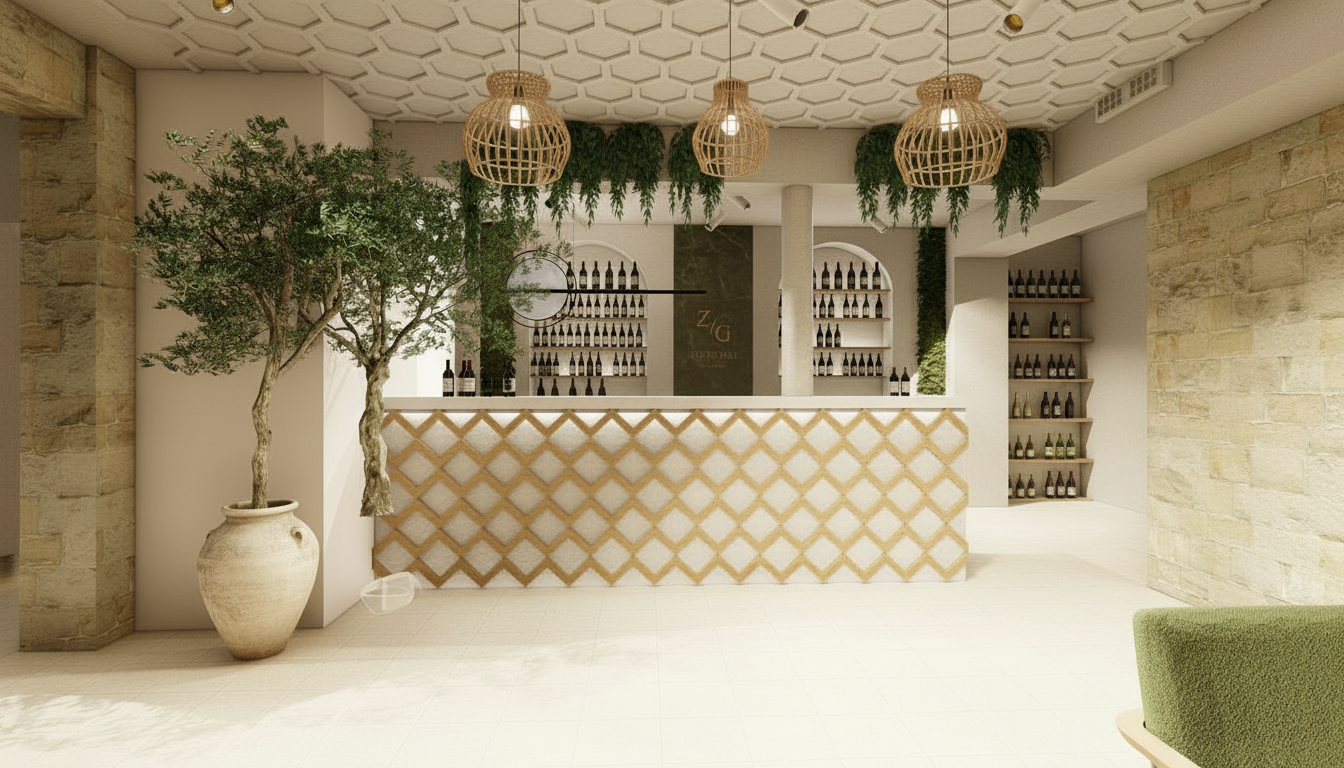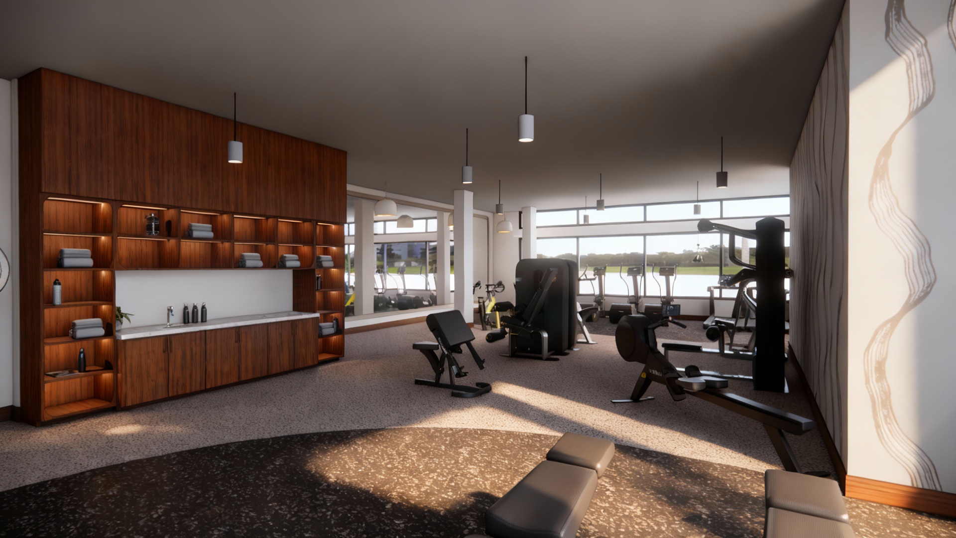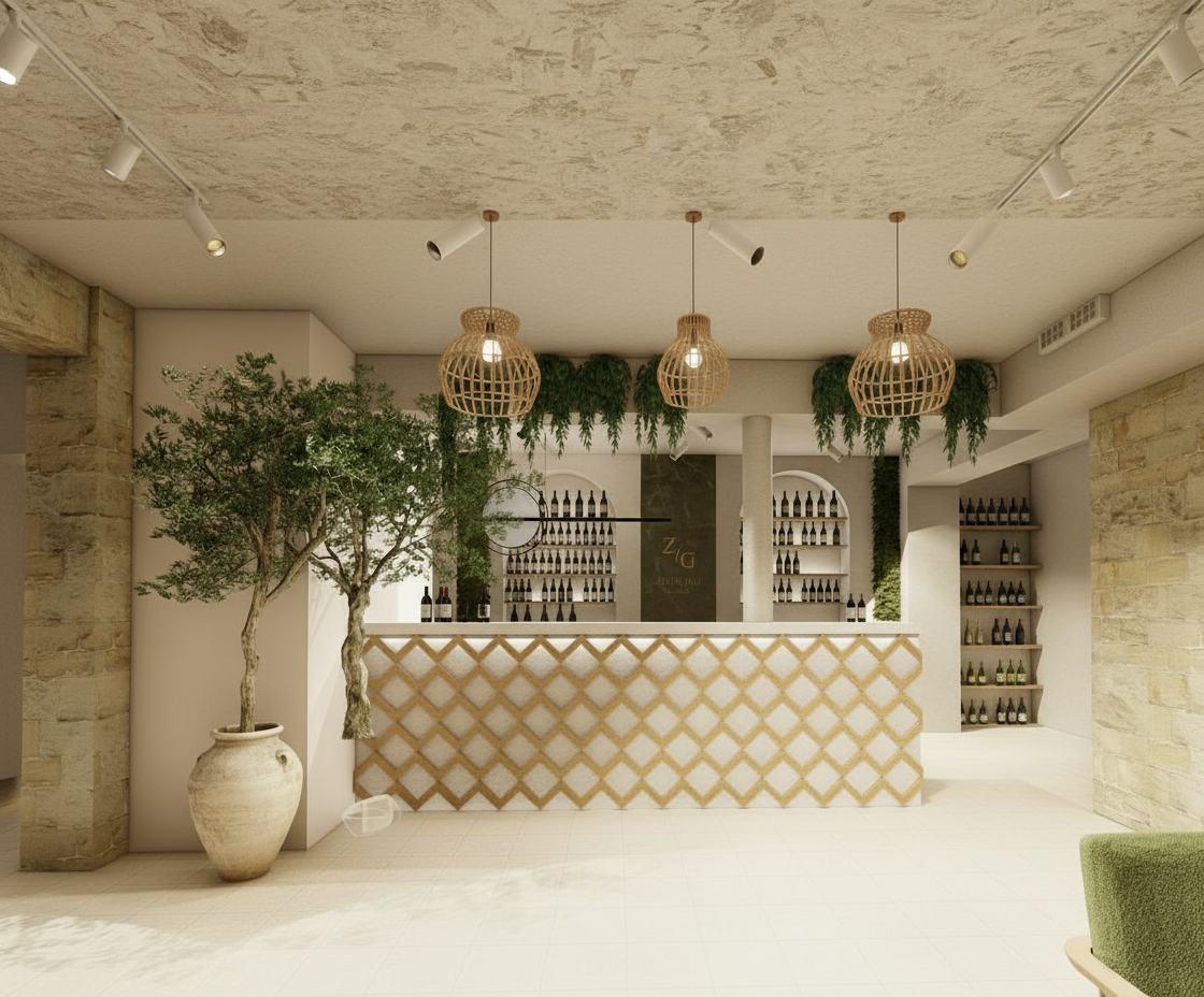 white stucco walls earth tone mountain stone rectangular bluestone paving at patio modern patio furnishings person in pool add narrow stone stair from patio up to grass area add lush landscape to grass foreground and background add adults conversing on the patio and balcony add hosta plants in foreground of patio