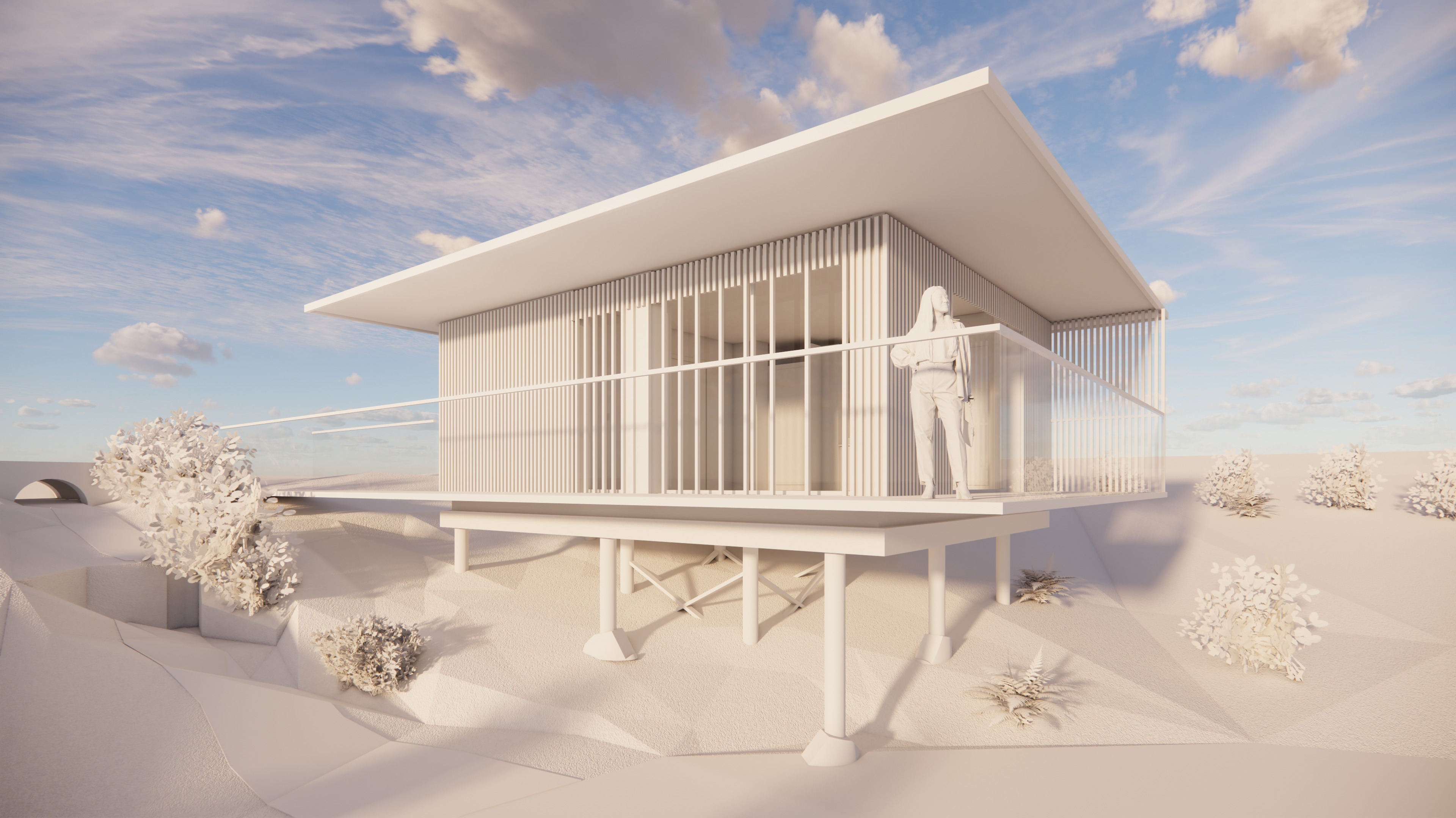 the wall material is dark gray wood posts soffit is wood clear please make it realistic and leave the landscape as it is the ground is dark brown with lush deciduous plants openings are in dark black external floor is dark black painted fundation is metal black