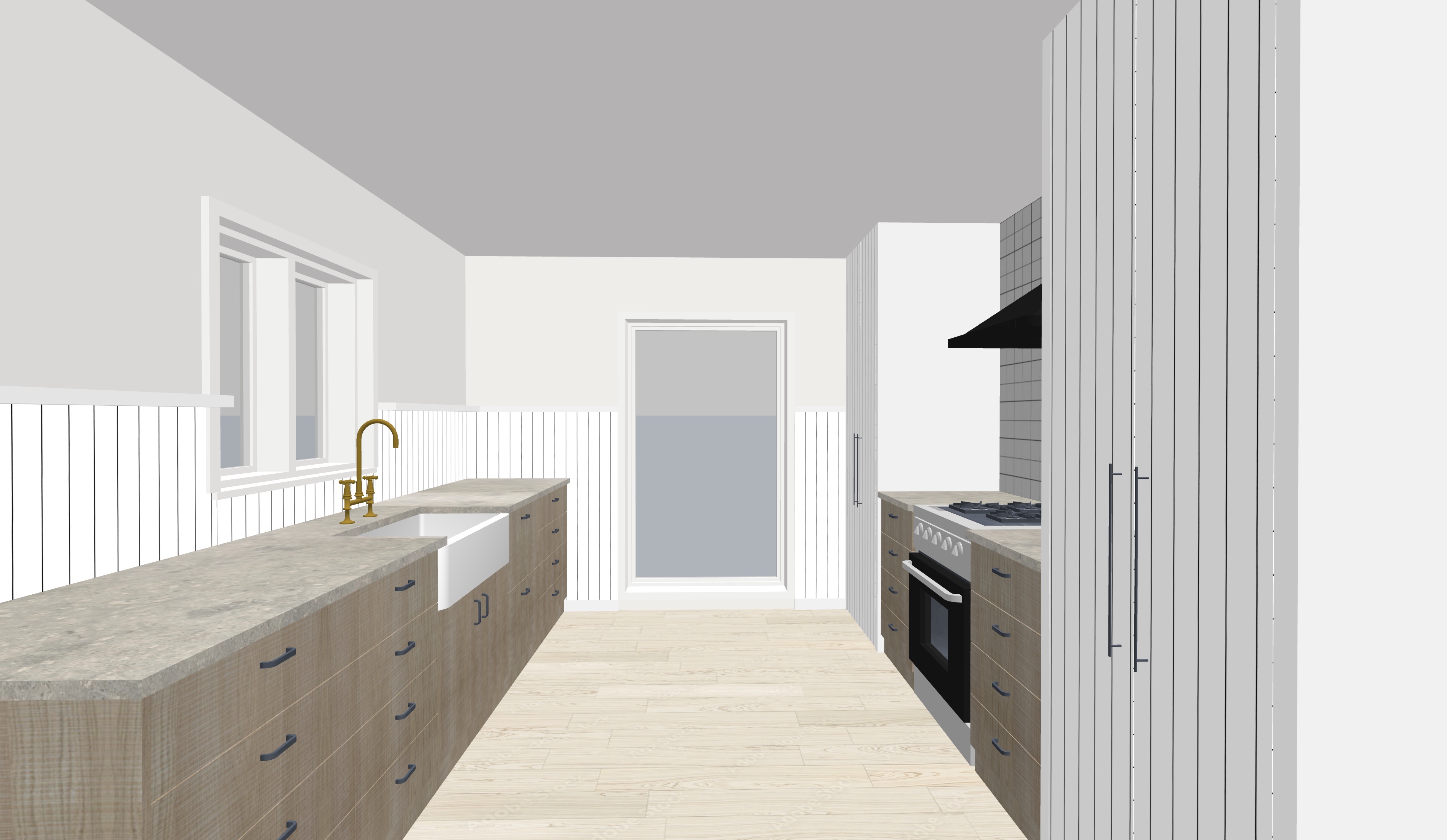 render a luxurious modern kitchen with a warm and inviting atmosphere a wainscot of white tongue groove boards is capped by a white ledge white framed windows offer country views misty morning brushed matte antique oak cabinets with forged iron handles ceppo stone counters unlacquered brass faucet tall cabinets also in tonque groove white a zellige tiled backsplash surrounds a black rangehood and in front a professional gas oven bleach ash wide plank floors