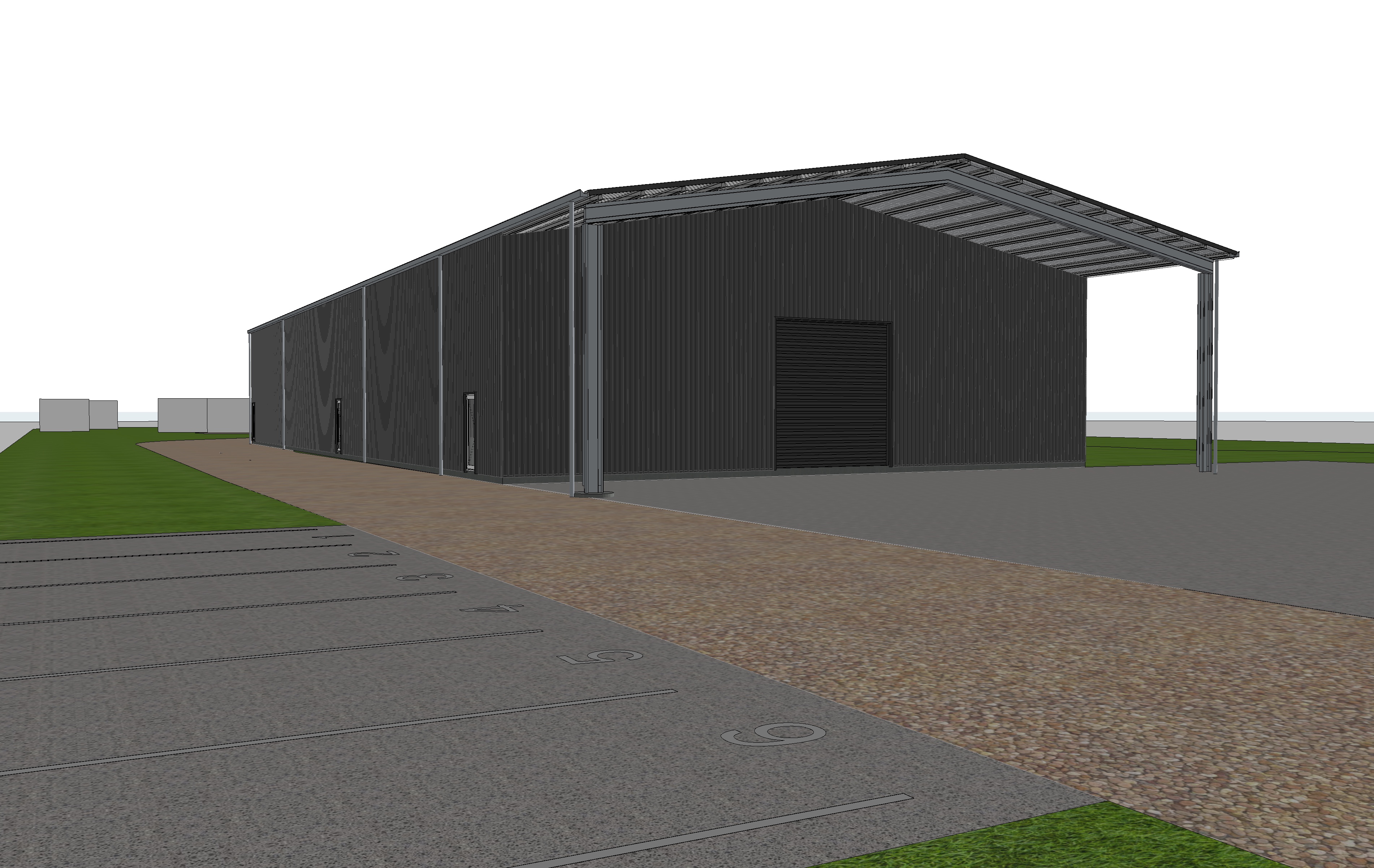 industrial warehouse with dark grey metal cladding in rural setting