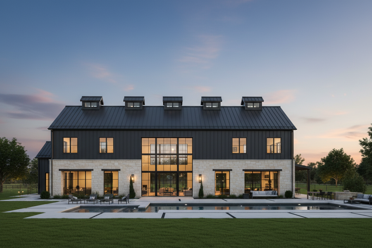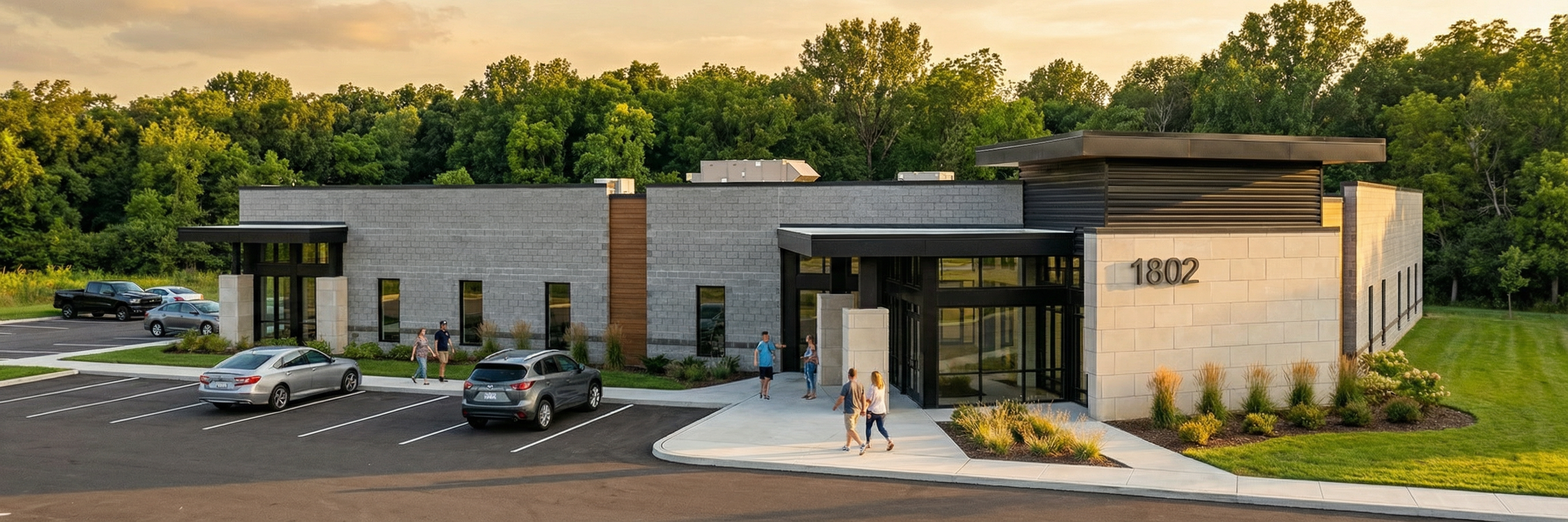 photorealistic architectural exterior render of the provided image preserving the existing building massing proportions and materials and elevating it to a high quality realistic visualization add landscaped grass areas with native planting low shrubs and ornamental grasses that are intentionally kept low and placed so they do not cover or obscure the building fa ade landscaping should frame the building and sidewalks while maintaining full visibility of all architectural features the background should consist entirely of mature trees forming a dense green tree line with no visible buildings beyond populate the scene with realistic people walking standing and talking along the sidewalk dressed in modern casual attire and scaled accurately to the architecture enhance the parking lot with clean realistic asphalt texture painted striping and parked cars in neutral modern colors the parking surface should appear well maintained with no tire marks or surface distressing use warm dusk or golden hour lighting with the sun positioned low in the sky to create a soft glowing atmosphere the building fa ade should be clearly illuminated with warm light showing material depth and texture while shadows remain soft and natural apply high resolution materials with accurate reflections roughness and depth include a realistic sky with warm tones balanced ambient light and subtle atmospheric depth render style ultra realistic professional architectural visualization dslr photography look cinematic warmth natural color balance realistic scale and proportions high detail sharp focus shadows to cast to the right