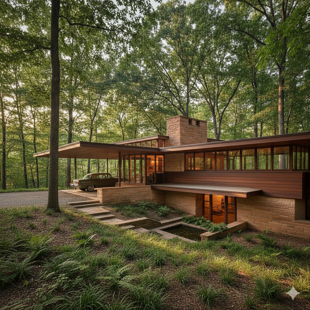 frank lloyd wright usonian style house in the woods simple forms flat extending roofs glass wood and stone