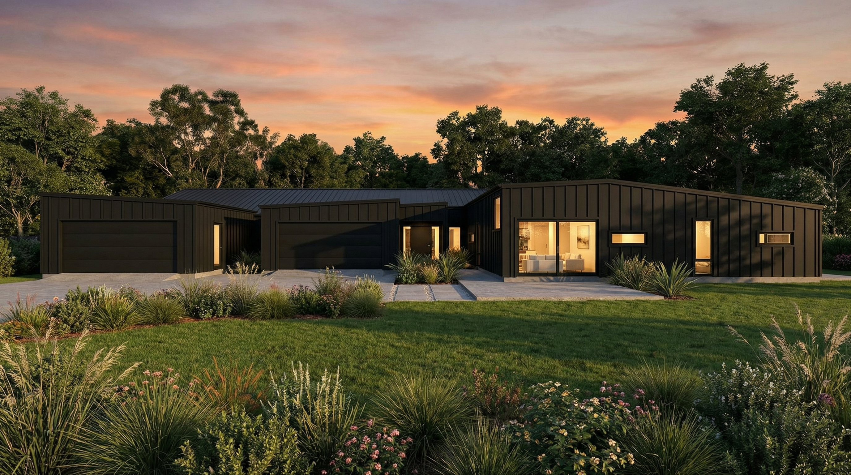 keep the perspective of the selected image black board and batten cladding black roof black window frames low timber decks lawn extensive native plants trees in background sunset interior lights on
