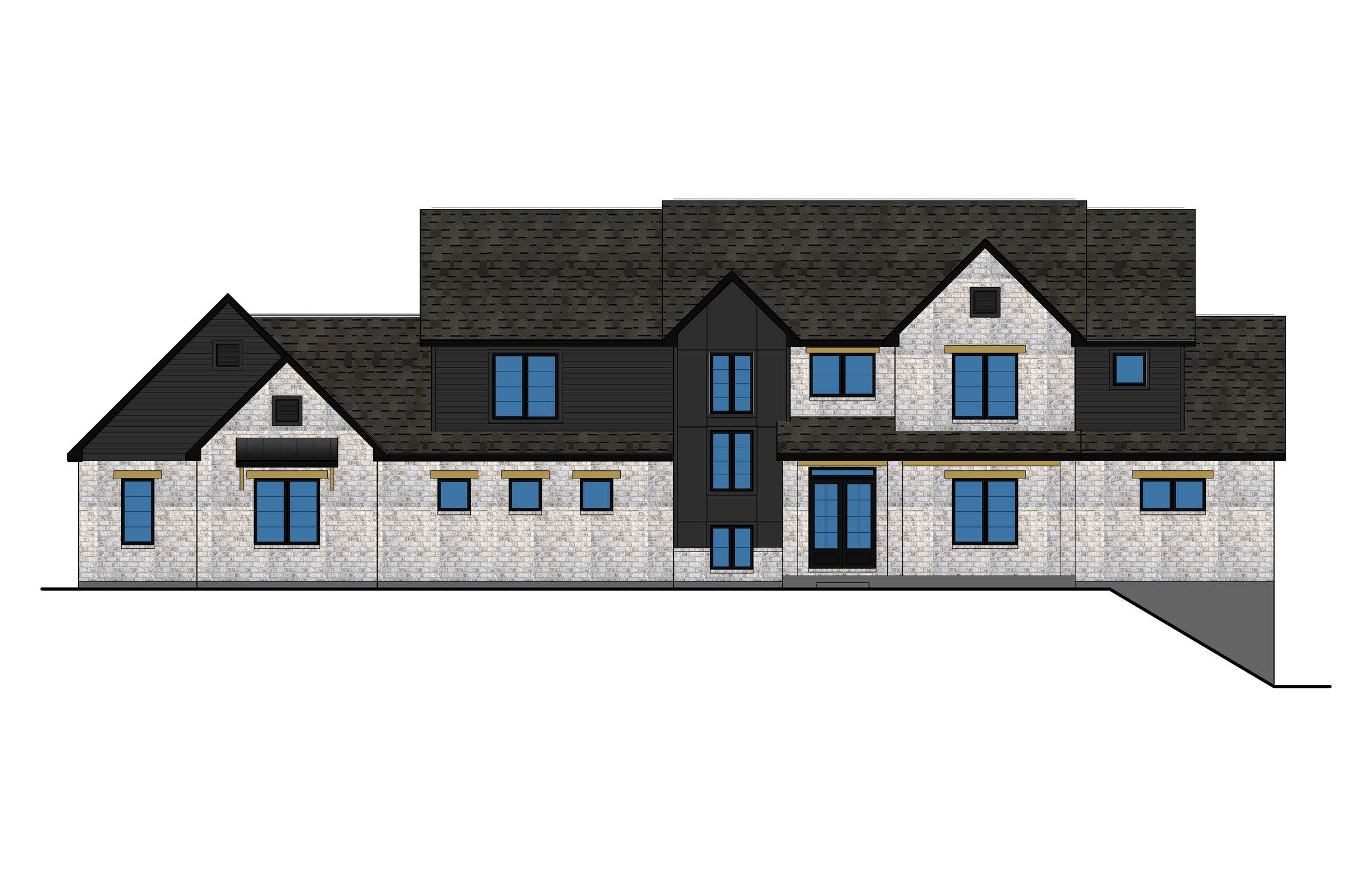 render a three dimensional image of the home referencing the color arrangement with painted white brick black horizontal siding and black panel siding with black windows and trim with black shingle roof and wood headers above the doors rendering with vegetation in the front and a wooded lot in the rear on a sunny day