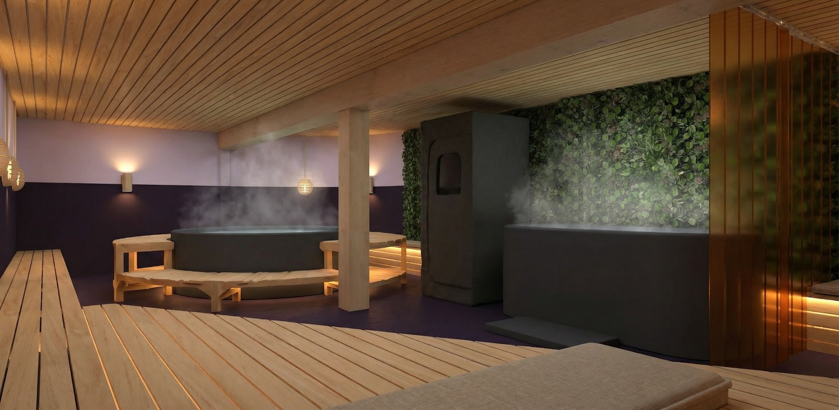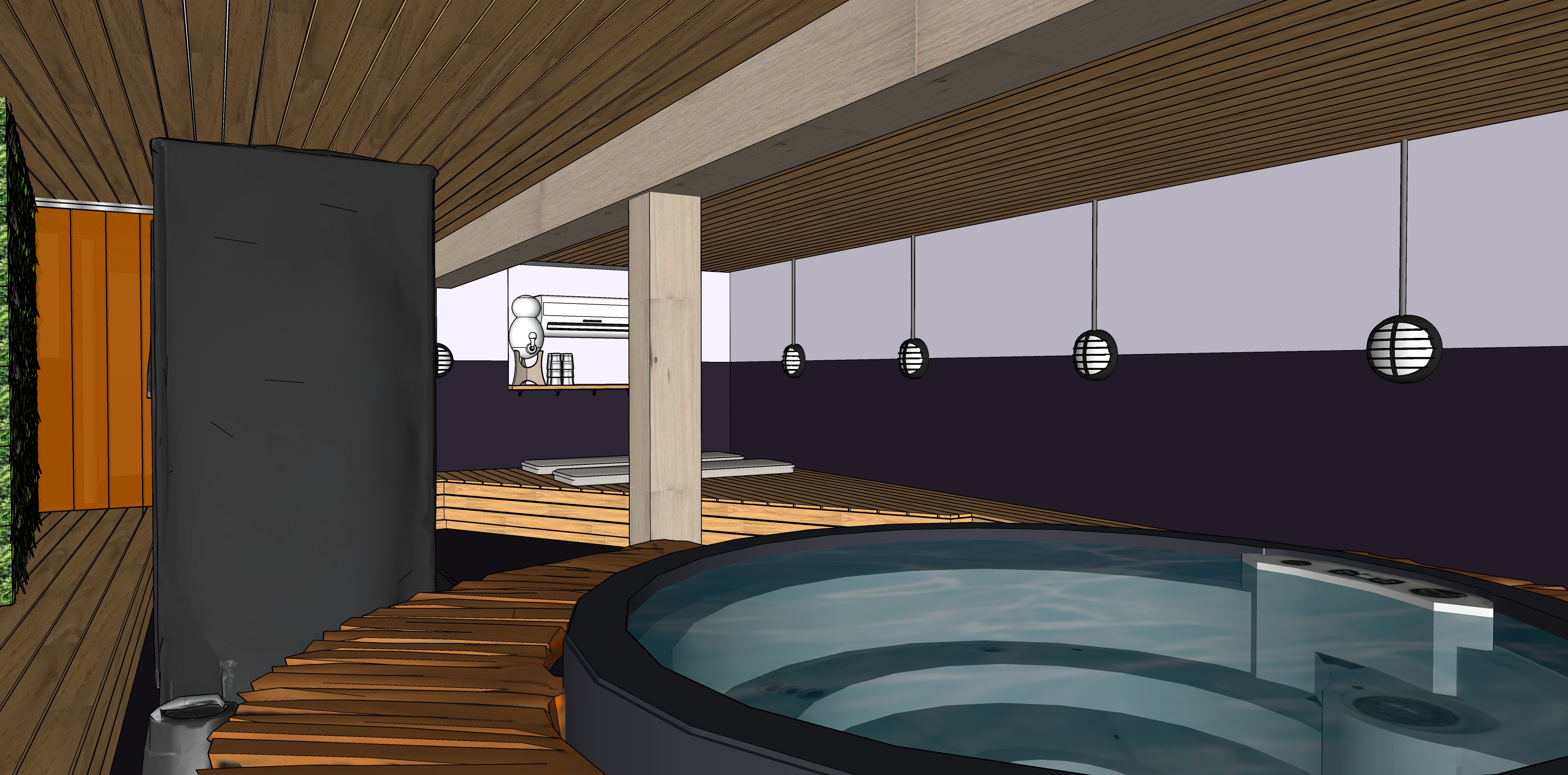 do not change the colors materials finish keep the viewing angle turn on the wall lights it is a basement without windows but still bright ambiance with dim lighting the floor is painted dark purple concrete the bottom of the dry walls are dark purple but the top of the walls is white with a very little tint of lavender colored the curtain is made of frosted amber plastic slats the ceiling and the benches are made of wood dried construction spruce light wood lumber the cushions on the benches are made of linen the structure around the spa is made of wooden slats the exterior of the spa is a dark gray make a light under the wood bench make a splash in the spa