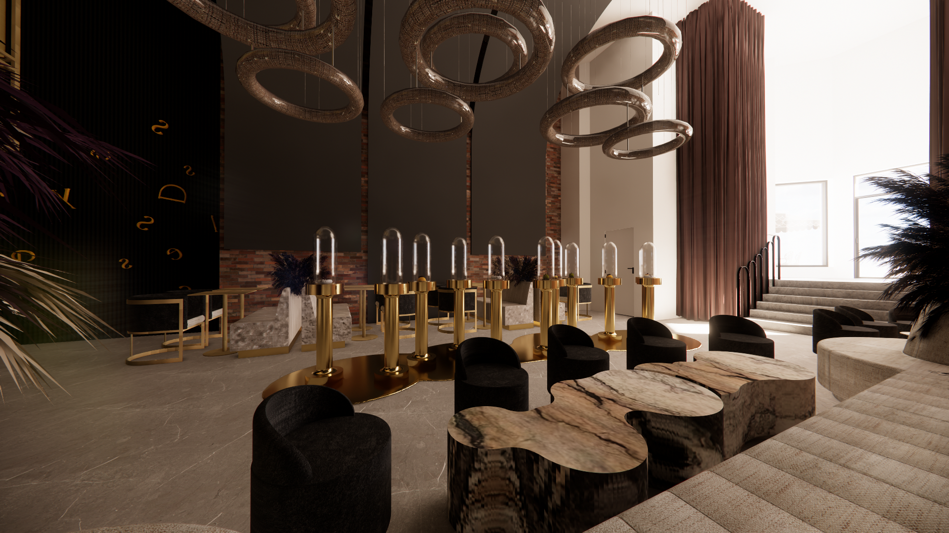 add graphic of a sunset on the grey curve create the image all the way to the top don t change any furniture and don t add anything just a sunset image on the walls