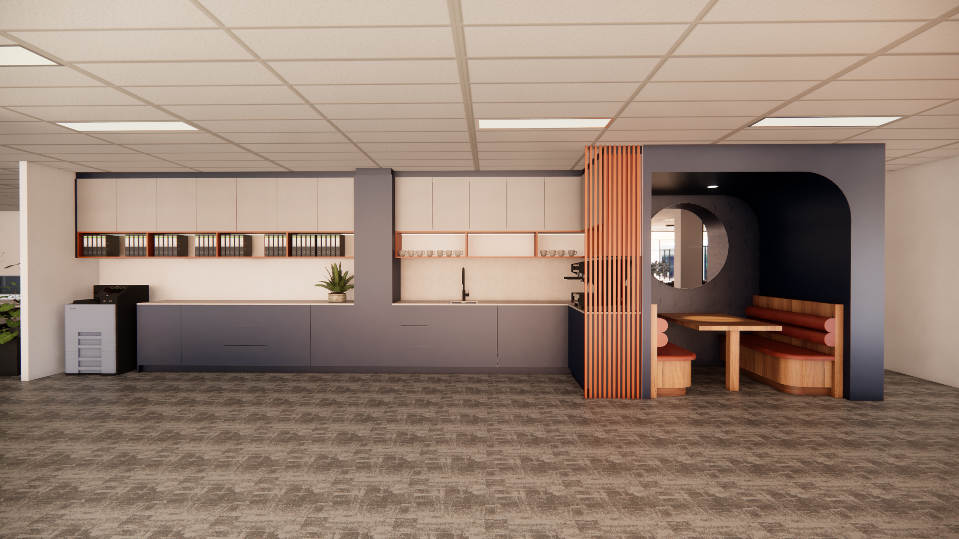 create a high end photorealistic interior render of this exact scene do not change the design layout geometry furniture placement materials or colour palette maintain all proposed finishes exactly as shown flooring wall finishes joinery ceiling glazing etc enhance realism sharper material definition higher texture resolution true to life reflections realistic shadows correct scale and perspective lighting upgrade improve exposure and lighting balance with soft realistic interior lighting natural global illumination more accurate shadow softness and subtle bounce light remove flat lighting and make it look like a professionally rendered architectural visualization specific change required replace the printer on the left with a realistic modern commercial office printer canon hp style correct size and proportions realistic details control panel paper trays matching the scene lighting and shadow direction output should look like a premium professional render v ray corona quality with realistic depth clarity and subtle camera bloom use high resolution clean image no grain add a little bit of warmth reduce natural daylight
