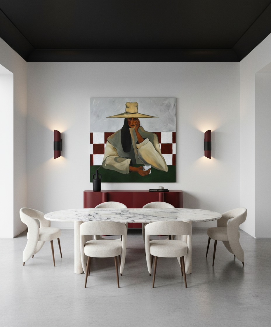 room floor is concrete walls are white ceiling is double height and black the dinning table top is calacatta viola marble the base is travertine put 4 dinning chairs make the buffet wider make the art work big