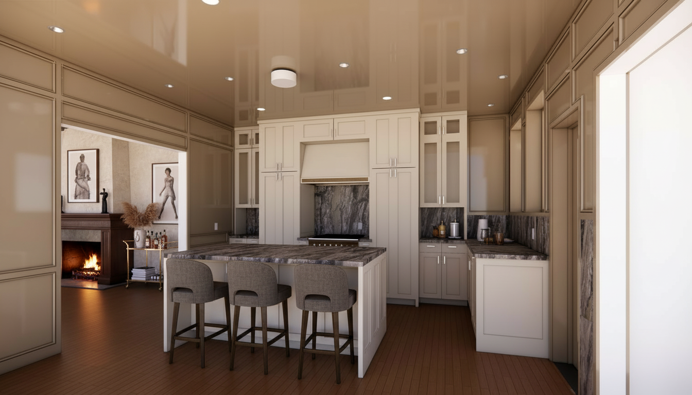 8k output photo realistic elle decor or architectural digest editorial photo setting kitchen paneled walls shaker style cabinets in beige calacatta picasso counters and backsplash unlacquered brass cabinet hardware bertazzoni range stools at island do not change geometry of architecture or casework only add textures people and accessories through the opening on the left is a view of the living room club like atmosphere add fireplace bar cart high end accessories art on walls contemporary figurative textures add surface imperfections brush marks graining reflections floor is medium brown oak plank flooring 12 wide realistic wood grain specular reflections undercabinet lighting moooi flock of lights chandelier over island light temperature 2700k