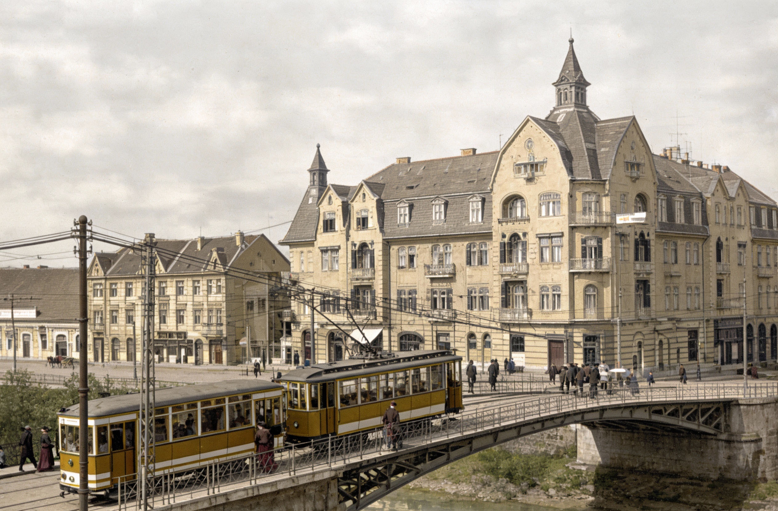 remove text from the top of picture put people on the ground flat river under the bridge light ochre beige facade 1910 s atmosphere people dressed in 1910 s style dressings dark window and door frames