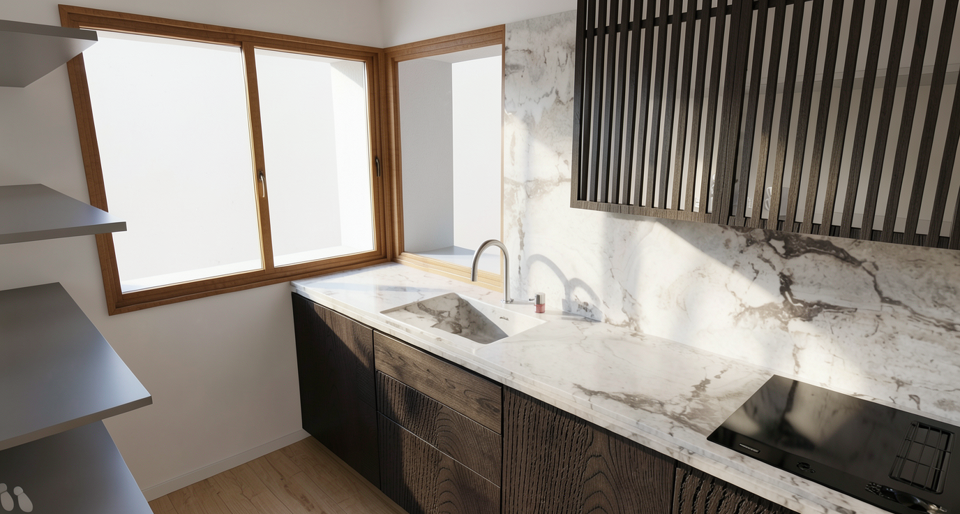 photorealistic render of a modern l shaped kitchen strictly preserving the original geometry layout and proportions of the model materials tall units on the right in glossy white glass highly reflective with realistic depth and subtle light refraction base units and wall units in glossy white lacquer smooth clean and uniform finish countertop and backsplash in laminam calacatta michelangelo porcelain stoneware white base with soft warm grey veining natural satin finish appliances built in black oven and microwave with realistic reflections integrated wine cooler with glass door and visible bottles soft internal lighting lighting bright natural daylight entering from the front windows above the sink soft diffused sunlight creating realistic shadows across the long countertop subtle reflections on glossy lacquer and glass surfaces balanced global illumination bright and natural avoid artificial showroom lighting environment clean elegant and contemporary kitchen space realistic light bouncing on floor and furniture soft ambient occlusion to enhance depth under cabinets and along edges slight depth of field for a photographic look realism details very subtle imperfections on glossy lacquer to avoid plastic look accurate glass refraction and reflections on tall units well defined but natural marble veining not exaggerated neutral color balance no overexposure on white surfaces camera wide angle lens 28 32mm camera height approx 155 165 cm frontal perspective slightly angled to show both the linear run and the left corner keep vertical lines straight no distortion quality ultra realistic render high detail pbr materials global illumination ray tracing soft shadows realistic reflectionsadd minimal styling a matte black faucet a few elegant kitchen accessories on the countertop cutting board neutral objects slight warm tone in sunlight for a cozy and premium atmosphere enhance contrast slightly for a more commercial look preserve white tones without clipping maintain detail in highlights