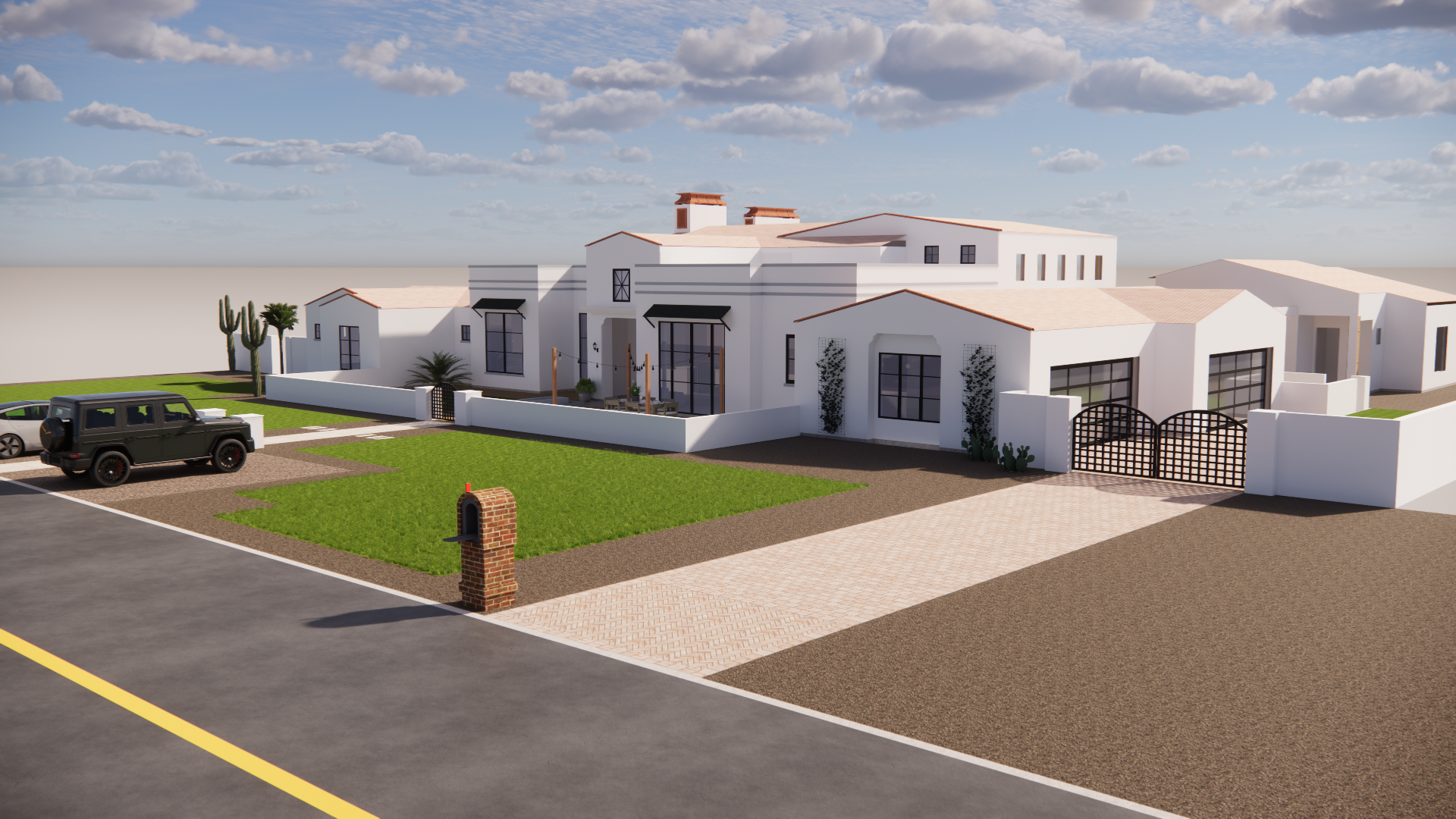 this home is in phoenix arizona render as a photo quality image with partly cloudy skies at 3 pm add some vegetation around the green lawn in the gravel perimeter
