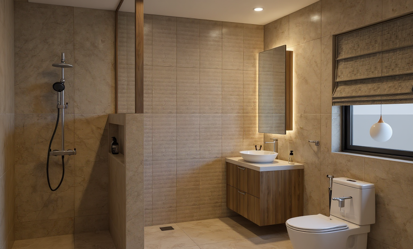 maintain tile texture feature wall beside vanity beige tone floor and wall tiles with less grain pattern perimeter dim led light around mirror cabinet low intensity lower contrast matt finishing no reflection turn on pendant light