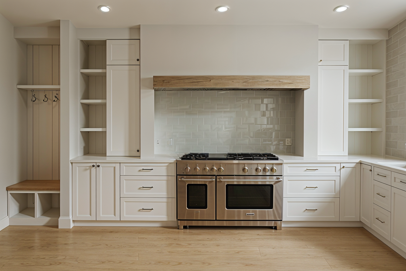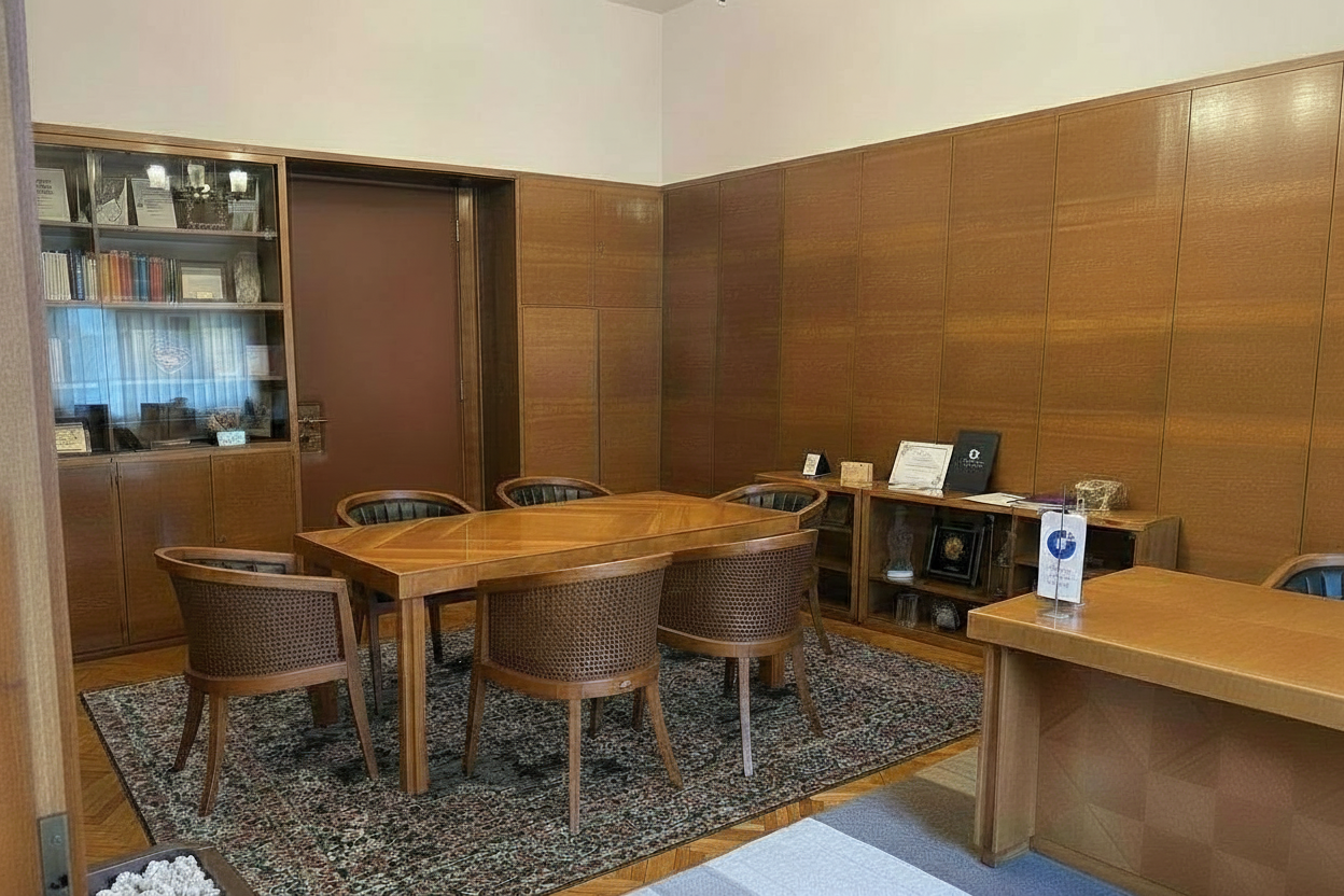 replace the part of the blue carpet that is partially visible under the workbench with the carpet that is under the dinnig set
