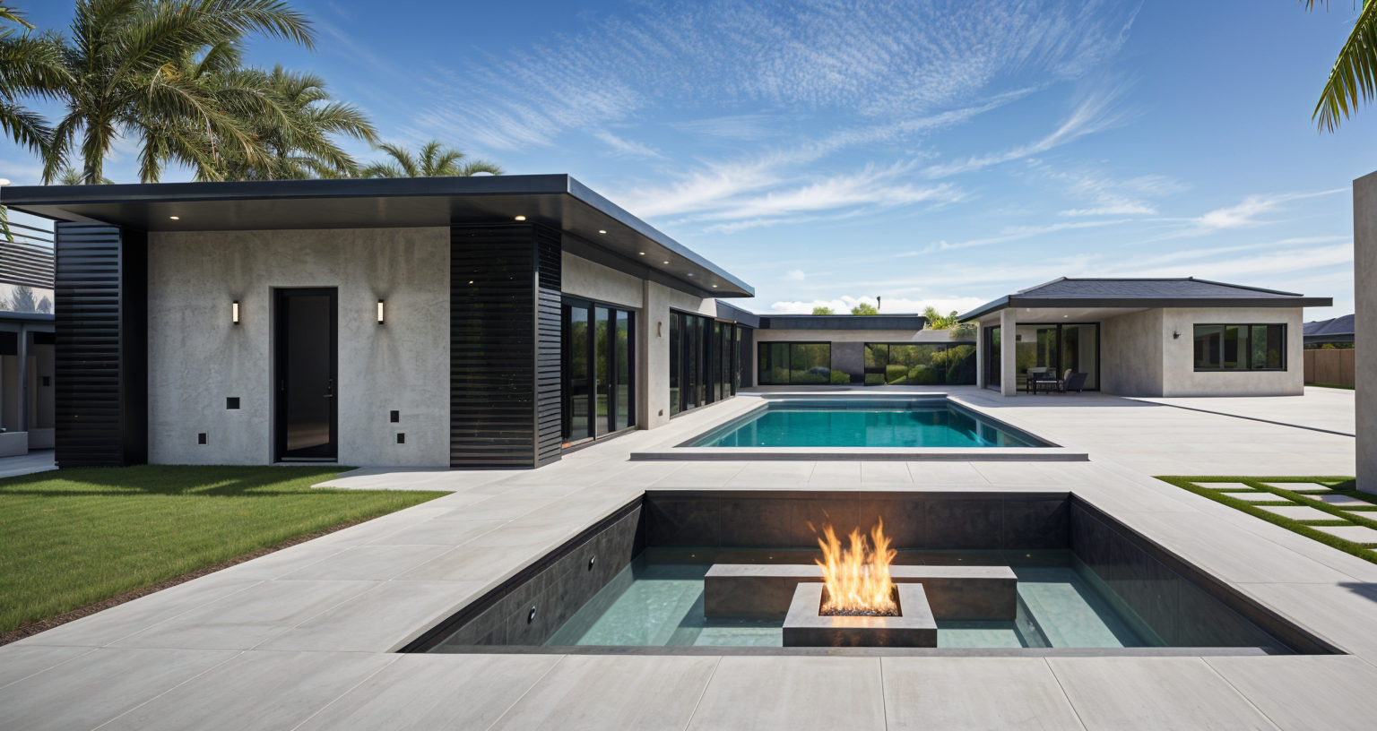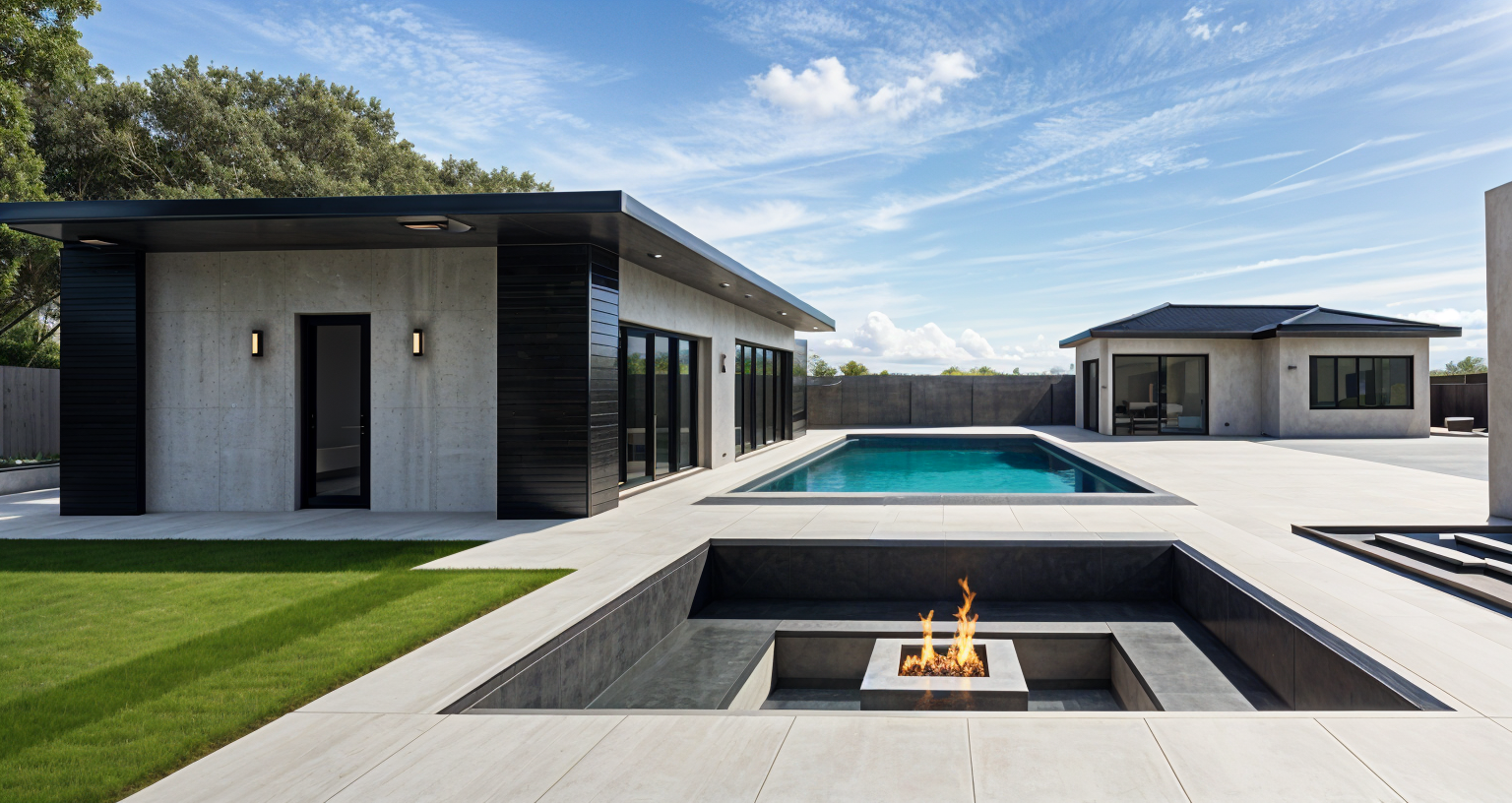 modernist exterior shot black driveway black cladded house black metal shed trees lining fence line grass out the backyard between shed and house architecture