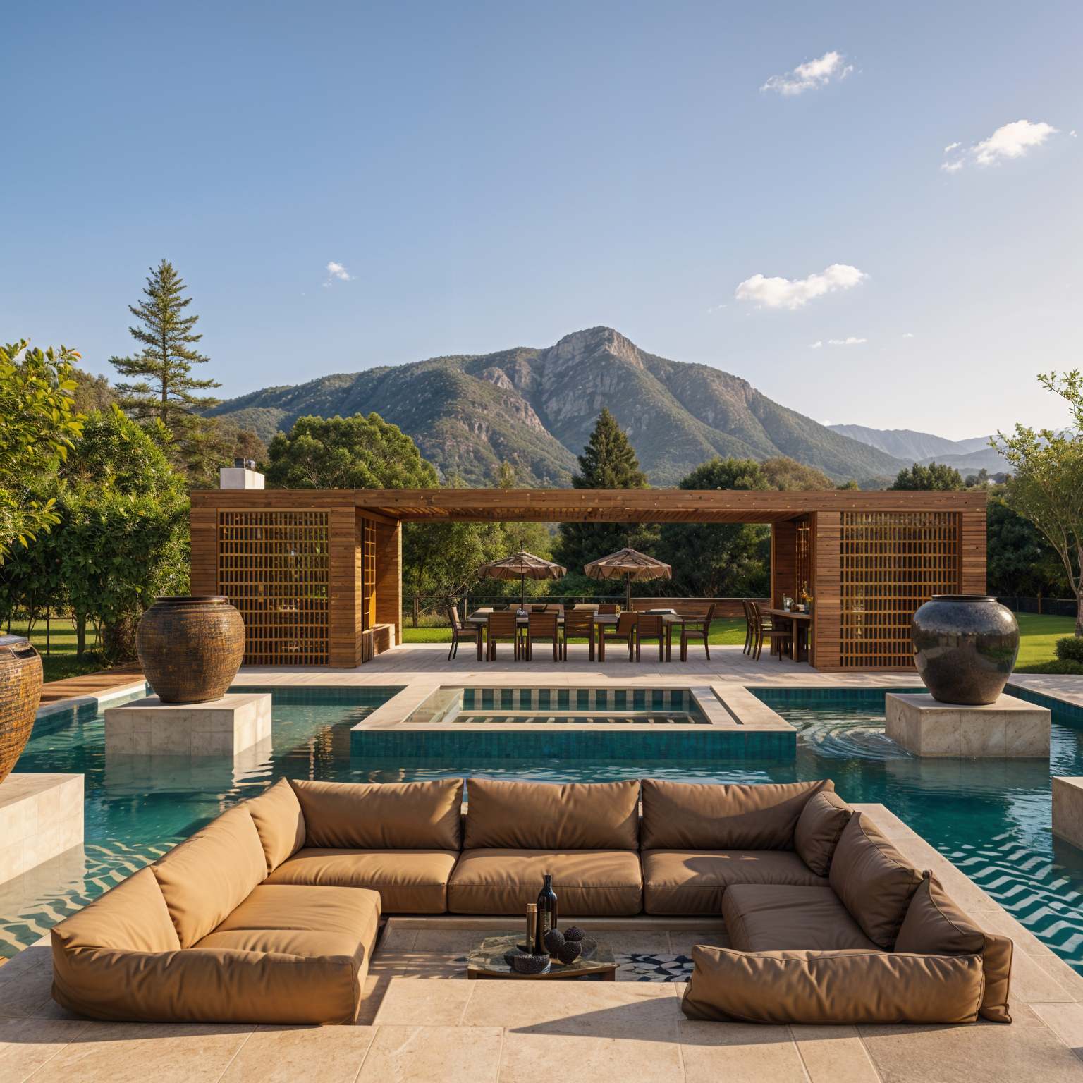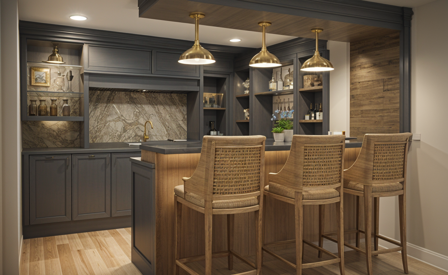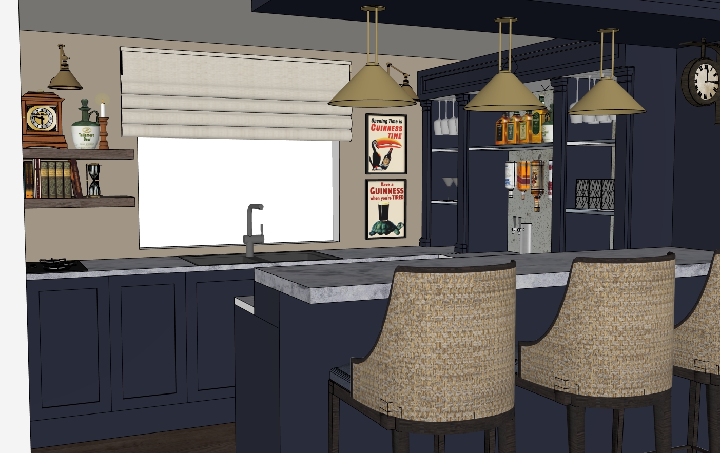 render a cozy and sophisticated bar setting with a modern vintage vibe use a deep navy for the bar cabinetry and shelving contrasted with a soft beige for the walls the countertop should have a bluish marble finish incorporate warm muted antique brass tones for the pendant lights and clock design bar stools with a woven texture and dark wood legs add retro style guinness posters to the walls for a nostalgic touch ensure a rustic wooden shelf holds an eclectic mix of books and vintage decor the atmosphere should feel inviting and stylish with a soft ambient lighting that highlights the textures and colors within the space