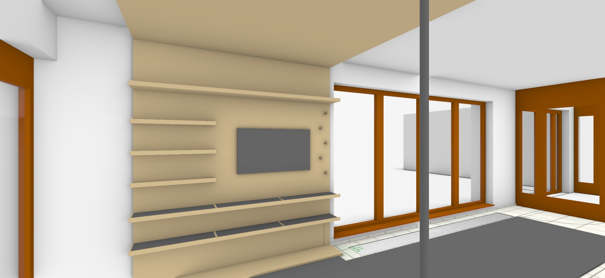 modernist exterior shot visualization of home fitness panel wall with shelves oak architecture
