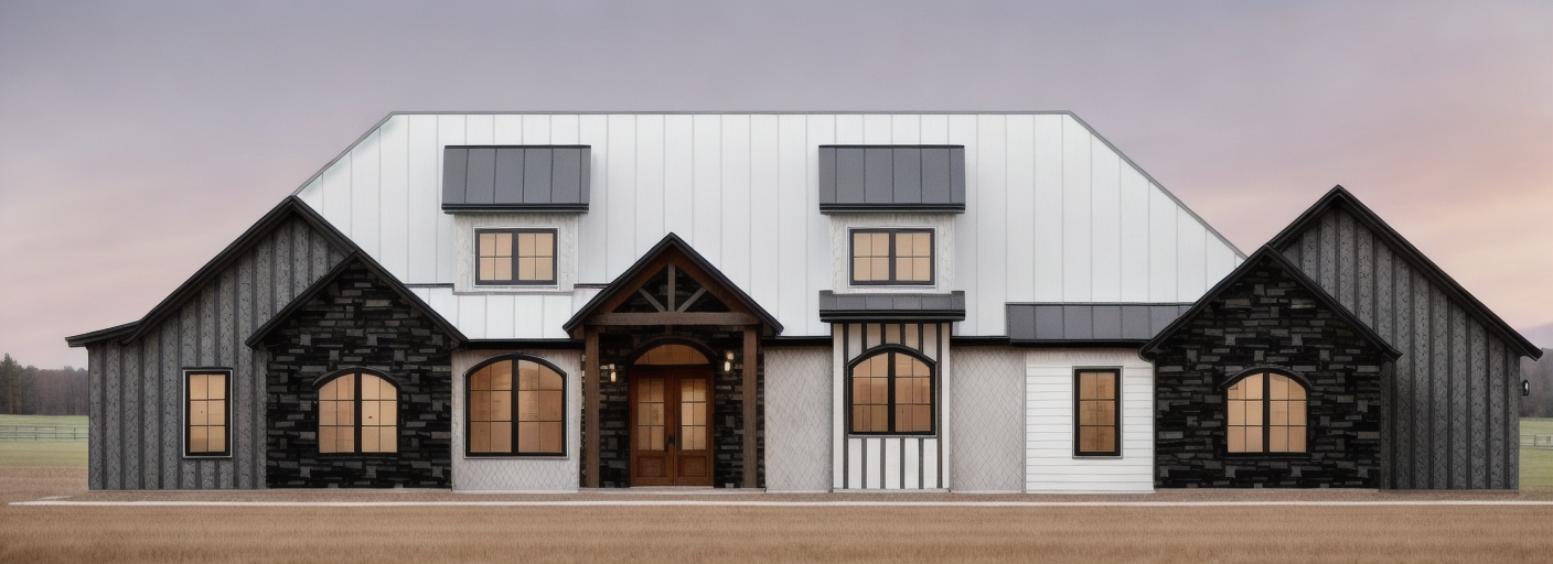 barndominium exterior shot exterior modern farmhouse with black roof black windows black board and batten siding brown wood timbers dark brown horizontal siding cream stone at front entry gable cream stone at gables white stucco architecture