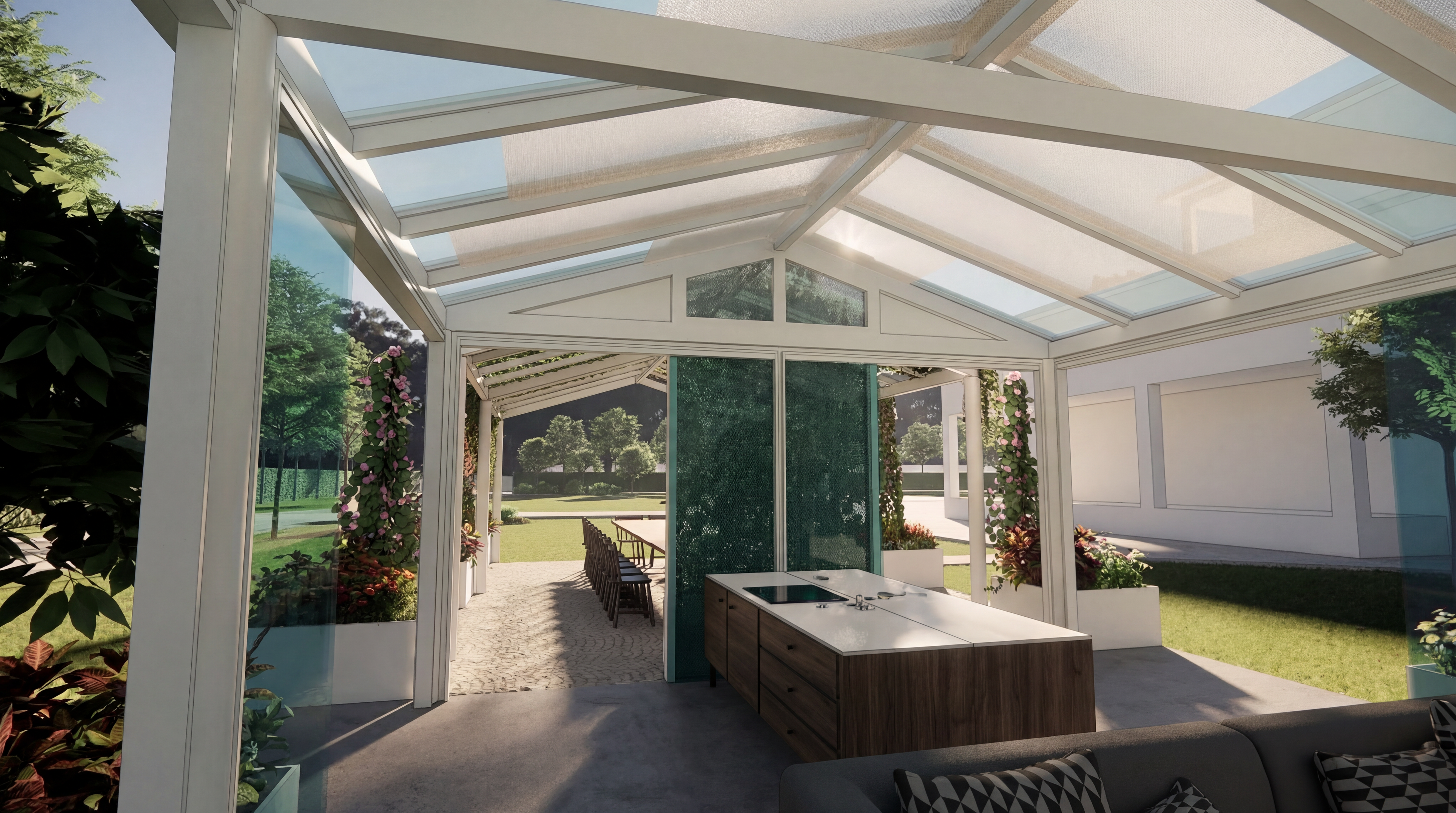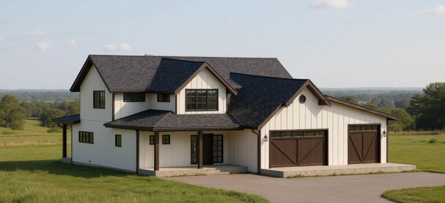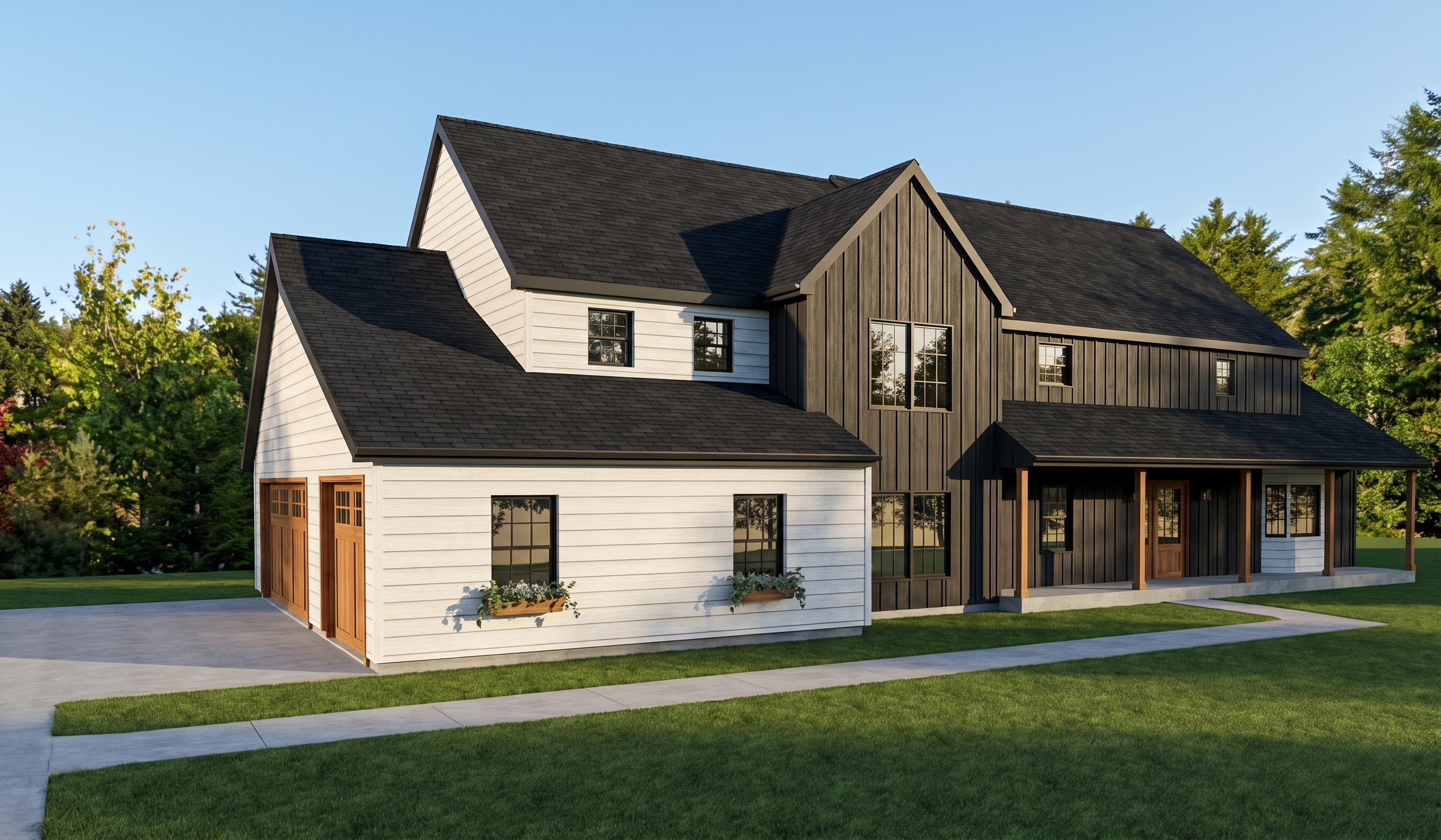 greyish brown vinyl lap siding dark bronze windows dark bronze painted panel shutters lightly landscaped a large tree visible from the other side of the house this is an image of a new covered patio on the back of a home