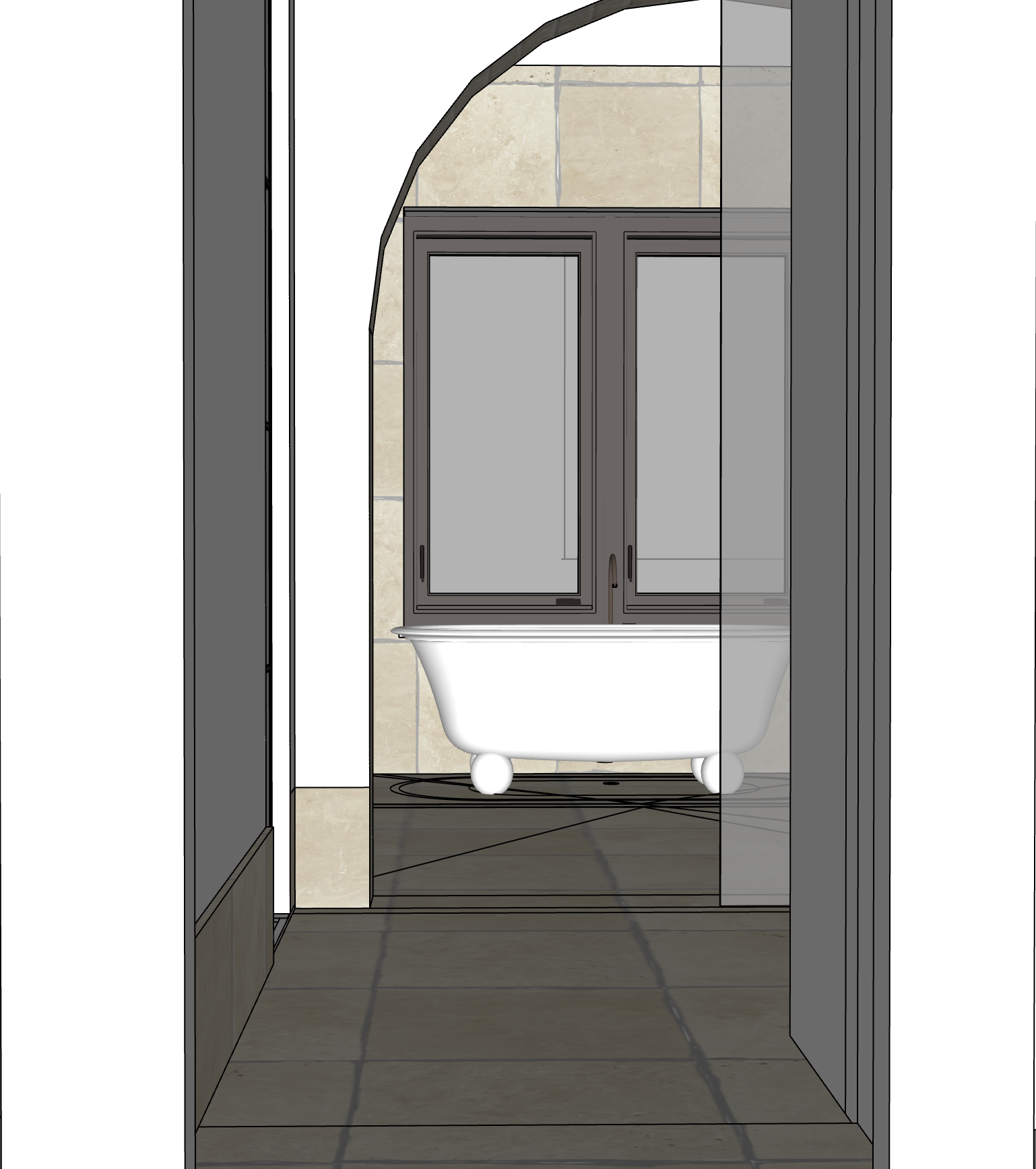please show afternoon light coming coming through the windows and greenery in the background make floor tiles travertine