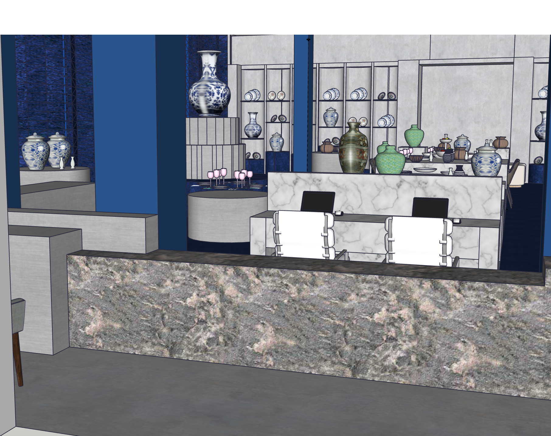 ceramic store this angle shows the front desk on the back the marble display table a round seating area with a display on top the displays are made of stainless steel the left wall is covered in blue velvet curtains the columns are dark blue the shelves on the back are concrete the floor from the front desk is concrete