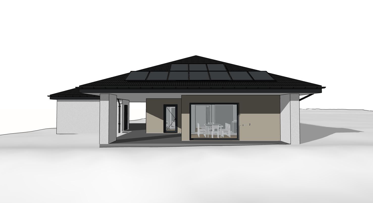 the house is new the clapboard siding is red it is set in connecticut place shrubs along the front of the house and tall trees behind the house the sun should illuminate the entire front of the house