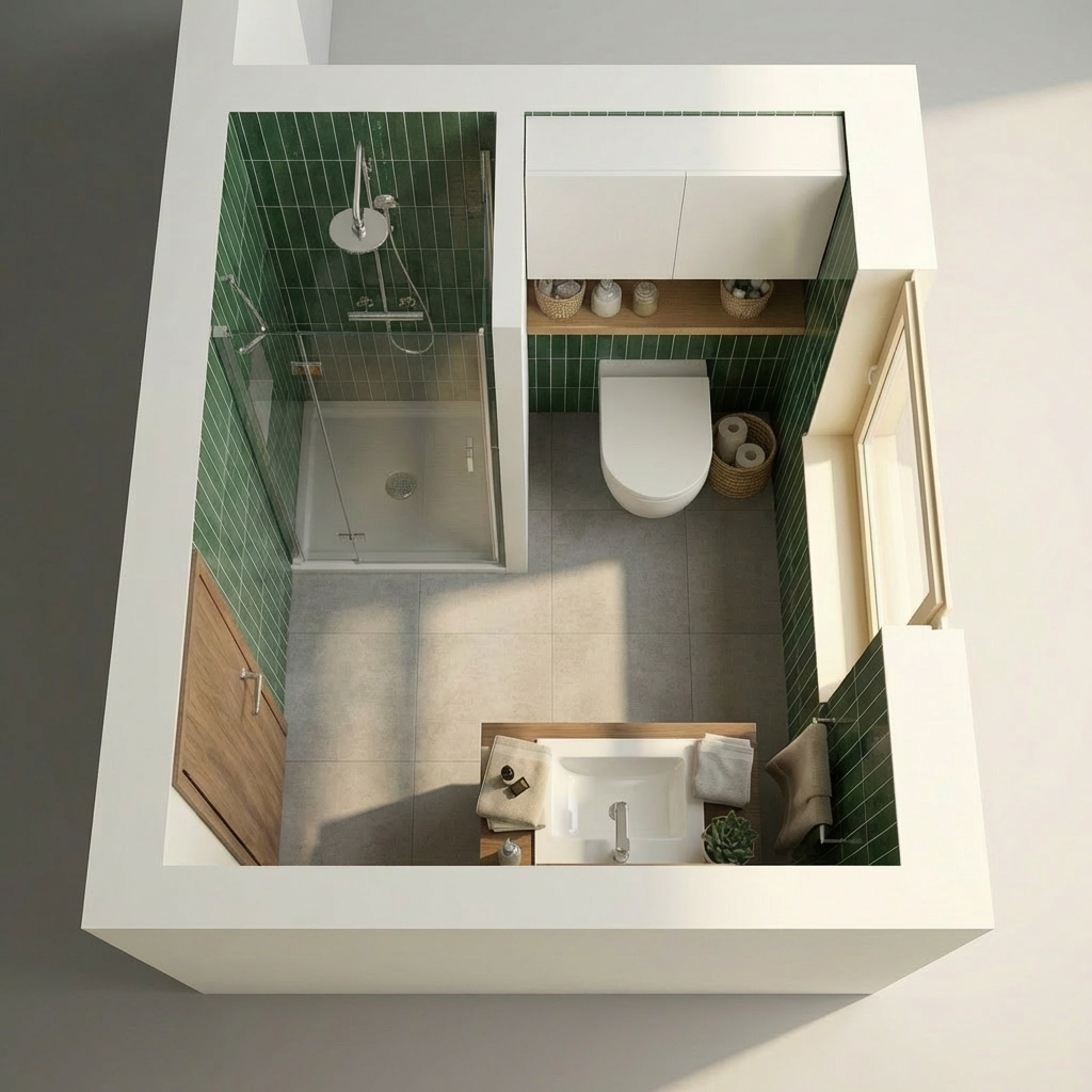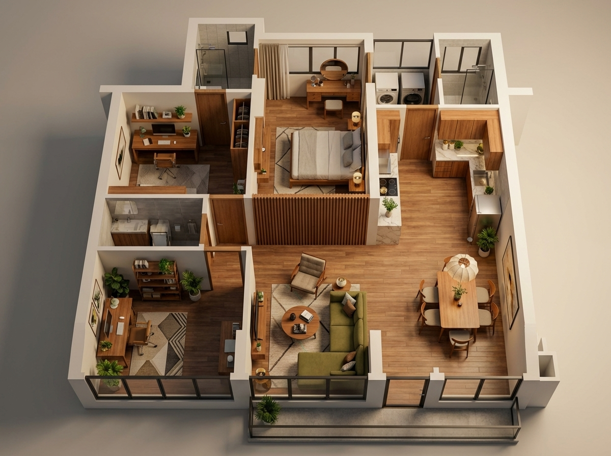 convert this floor plan into a realistic isometric 3d view of a full house show the space from an elevated angle with furniture walls and details visible change wall colors to white all except part inside shower use the same furniture as shows on the plan do not change the orientation of the floorplan